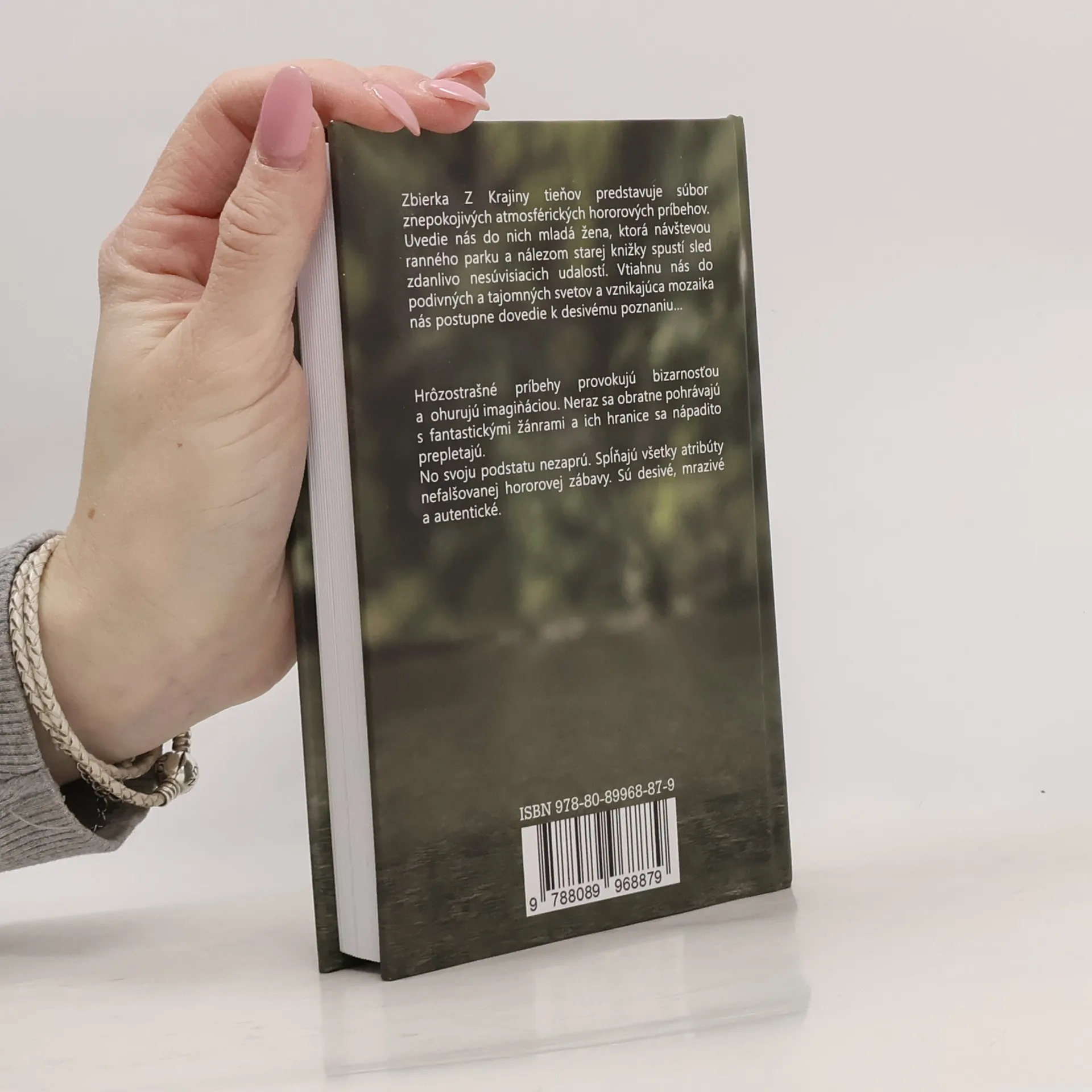 Zbierka Z krajiny tieňov predstavuje súbor znepokojivých atmosférických príbehov. Uvedie nás do nich mladá žena, ktorá návštevou ranného parkua nálezom starej knižky spustí sled zdanlivo nesúvisiacich udalostí. Tie nás vtiahnu do podivných a tajomných svetov, vznikajúca mozaika nás postupne dovedie k desivému poznaniu...Hrôzostrašné príbehy provokujú svojou bizarnosťou a ohurujú imagináciou. Neraz sa obratne pohrávajú s fantastickými žánrami a ich hranice sa nápadito prepletajú. No svoju podstatu nezaprú. Spĺňajú všetky atribúty nefalšovanej hororovej zábavy. Sú desivé, mrazivé a autentické.