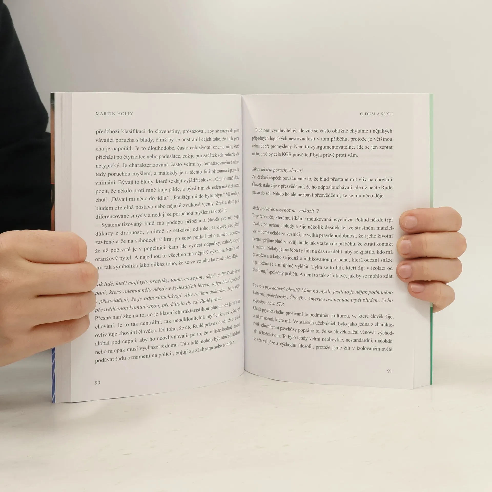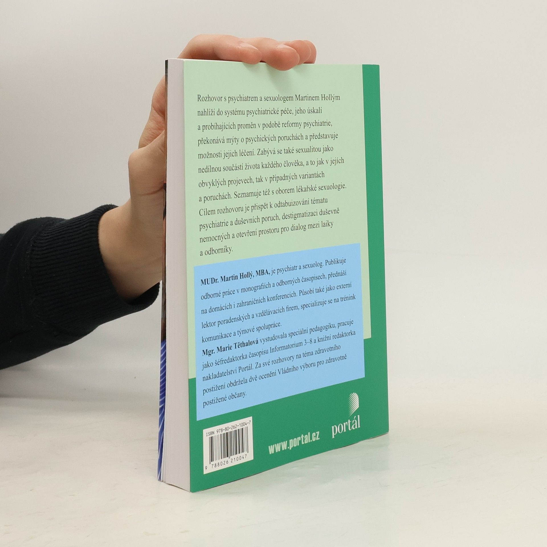 Rozhovor s psychiatrem a sexuologem Martinem Hollým nahlíží do systému psychiatrické péče, jeho úskalí a nadcházejících proměn v podobě reformy psychiatrie, překonává mýty o psychických poruchách a představuje možnosti jejich léčení. Zabývá se také sexualitou jako nedílnou součástí života každého člověka, a to jak v jejích obvyklých projevech, tak v případných variantách a poruchách. Cílem rozhovoru je přispět k odtabuizování tématu psychiatrie a duševních poruch, destigmatizace duševně nemocných a otevření prostoru pro dialog mezi laiky a odborníky. Seznamuje také s oborem lékařské sexuologie. MUDr. Martin Hollý, MBA, je psychiatr a sexuolog. Publikoval v monografii a odborných časopisech, přednáší na domácích i zahraničních konferencích. Působí také jako externí lektor poradenských a vzdělávacích firem, specializuje se na trénink komunikace a týmové spolupráce. Mgr. Marie Těthalová vystudovala speciální pedagogiku, pracuje jako šéfredaktorka časopisu Informatorium 3-8 a knižní redaktorka nakladatelství Portál. Za své rozhovory na téma zdravotního postižení obdržela dvě ocenění Vládního výboru pro zdravotně postižené občany.