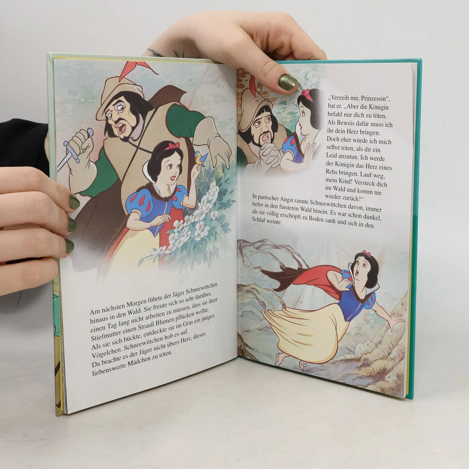 Schneewittchens Mutter ist bei der Geburt gestorben; die Stiefmutter ist eine stolze, böse Frau. Als der sprechende Spiegel ihr verkündet, Schneewittchen sei schöner als sie, befiehlt sie einem Jäger, das Mädchen zu töten. Dieser lässt es aber entkommen und es findet bei den sieben Zwergen eine neue Heimat. Doch die böse Königin erfährt davon durch ihren Spiegel und versucht dreimal, das Mädchen zu töten, das dritte Mal mit einem vergifteten Apfel. Jetzt halten die Zwerge es tatsächlich für tot und legen es in einen gläsernen Sarg. Ein vorüberreitender Prinz verliebt sich in Schneewittchen und will es mitnehmen.
