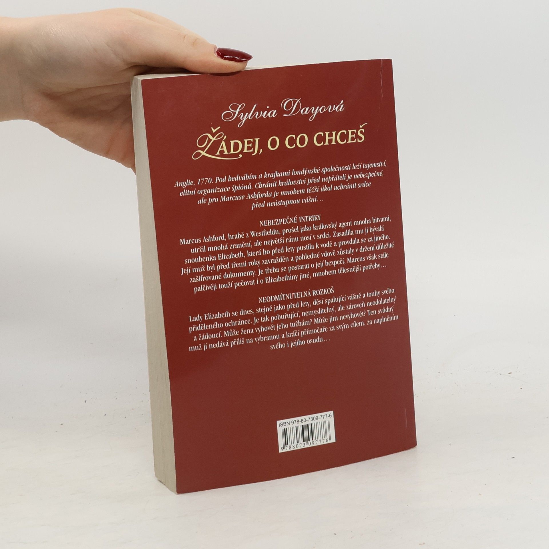 Anglie, 1770. Pod hedvábím a krajkami londýnské společnosti leží tajemství, elitní organizace špiónů. Chránit království před nepřáteli je nebezpečné, ale pro Marcuse Ashforda je mnohem těžší úkol uchránit srdce před neústupnou vášní... Lady Elizabeth se dnes, stejně jako před lety, děsí spalující vášně svého přiděleného ochránce. Je tak pobuřující, nemyslitelný, ale zároveň neodolatelný a žádoucí. Může žena vyhovět jeho tužbám? A může jim nevyhovět? Ten svůdný muž jí nedává příliš na vybranou..
