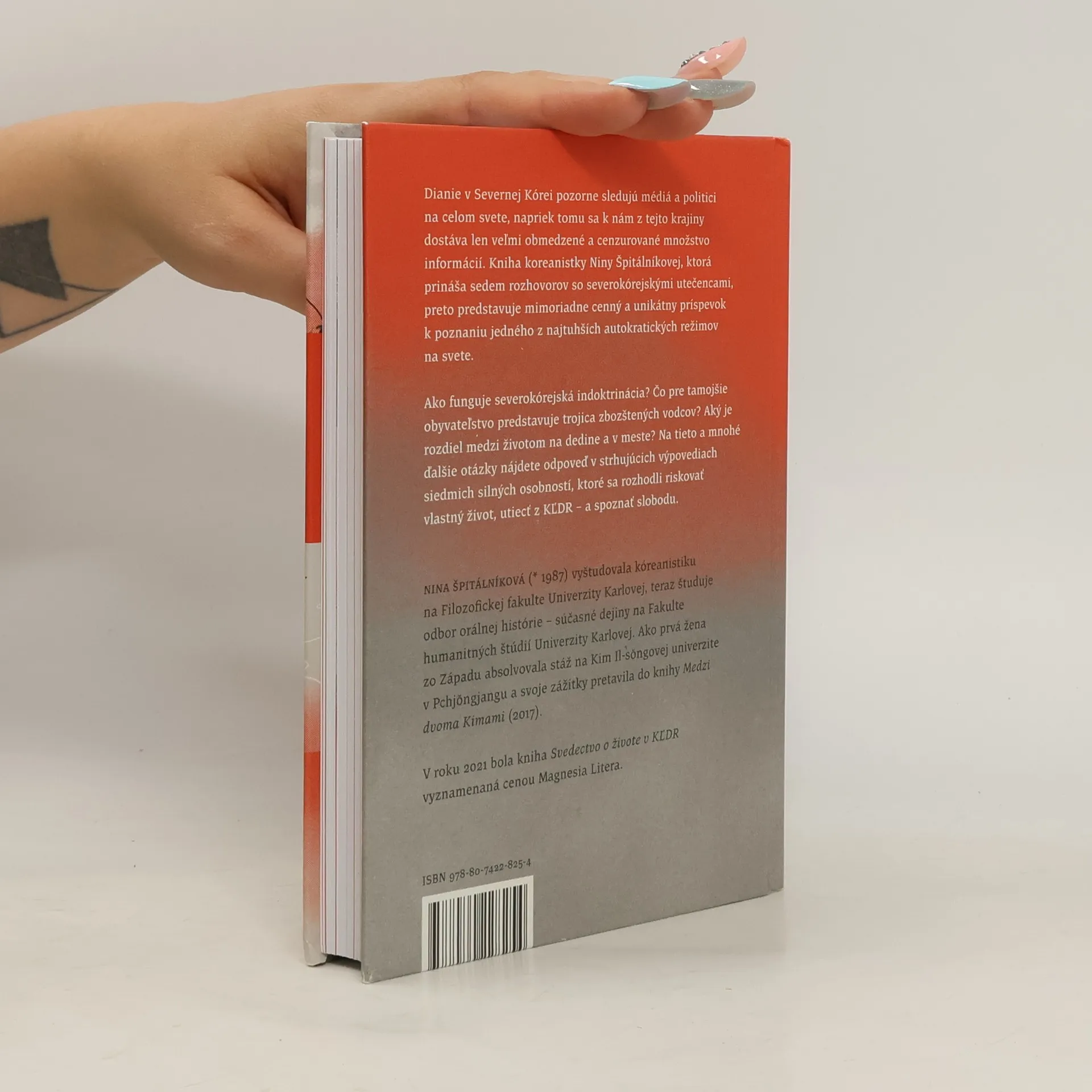 Dianie v Severnej Kórei pozorne sledujú médiá a politici na celom svete, napriek tomu sa k nám z tejto krajiny dostáva len veľmi obmedzené a cenzurované množstvo informácií. Kniha koreanistky Niny Špitálníkovej, ktorá prináša sedem rozhovorov so severokórejskými utečencami, preto predstavuje mimoriadne cenný a unikátny príspevok k poznaniu jedného z najtuhších autokratických režimov na svete. Ako funguje severokórejská indoktrinácia? Čo pre tamojšie obyvateľstvo predstavuje trojica zbožštěných vodcov? Aký je rozdiel medzi životom na dedine a v meste? Na tieto a mnohé ďalšie otázky nájdete odpoveď v strhujúcich výpovediach siedmich silných osobností, ktoré sa rozhodli riskovať vlastný život, utiecť z KĽDR - a spoznať slobodu. Nina Špitálníková (* 1987) vyštudovala kóreanistiku na Filozofickej fakulte Univerzity Karlovej, teraz študuje odbor orálnej histórie – súčasné dejiny na Fakulte humanitných štúdií Univerzity Karlovej. Ako prvá žena zo Západu absolvovala stáž na Kim Il-s?ngovej univerzite v Pchj?ngjangu a svoje zážitky pretavila do knihy Medzi dvoma Kimami (2017). V roku 2021 bola kniha Svedectvo o živote v KĽDR vyznamenaná cenou Magnesia Litera.