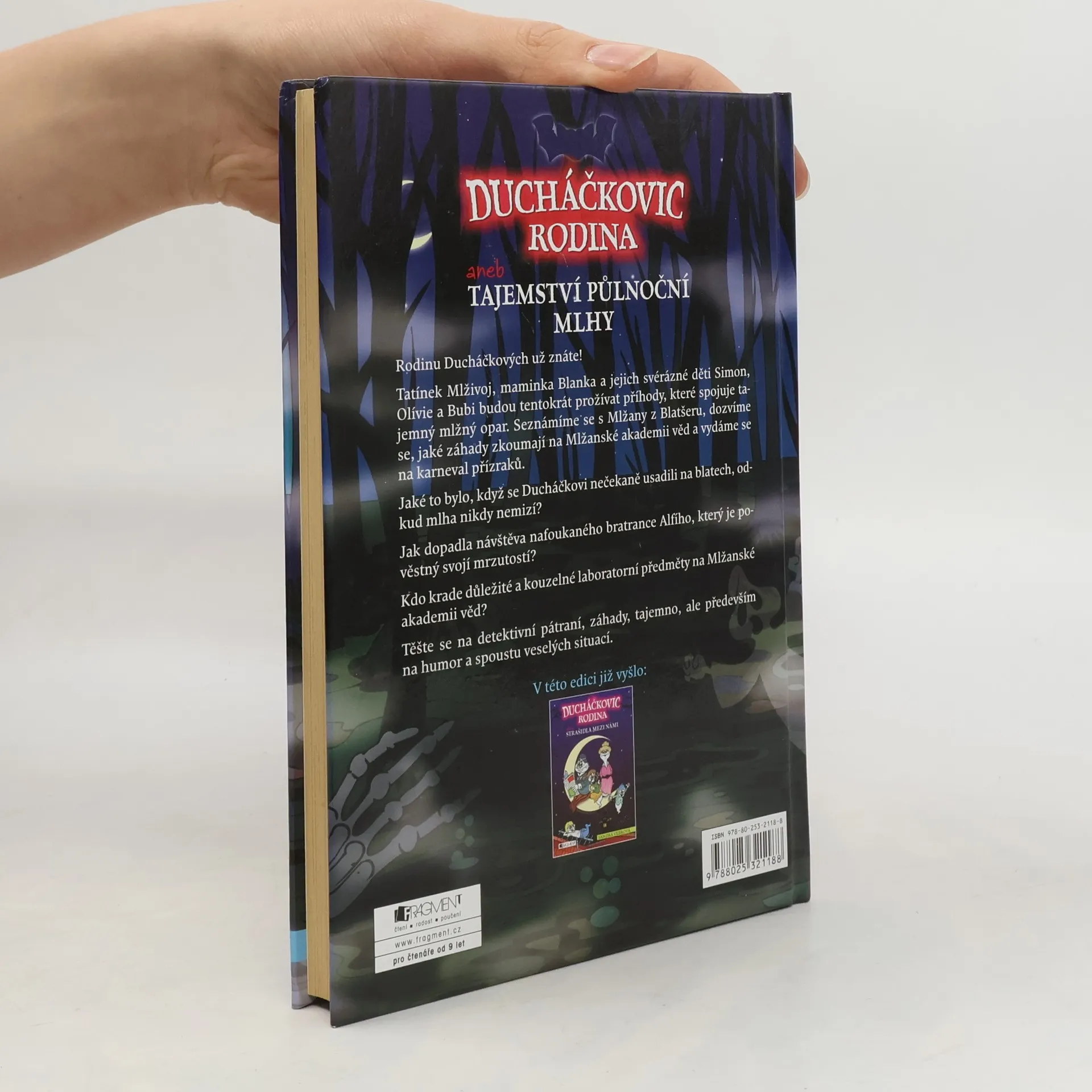 Mlha pomalu řídne... a ano, už je vidíme! Rodina Ducháčkových a s nimi nové příběhy plné napětí, dobrodružství a humoru. Rodinu Ducháčkových už znáte! Tatínek Mlživoj, maminka Blanka a jejich svérázné děti Simon, Olivie a Bubi budou tentokrát prožívat příhody, které spojuje tajemný mlžný opar. Seznámíme se s Mlžany z Blatšeru, dozvíme se, jaké záhady zkoumají na Mlžanské akademii věd a vydáme se na mlžanský karneval přízraků. Jaké to bylo, když se Ducháčkovi se svým stěhovavým domem usadili na blatech? Jak dopadla návštěva nafoukaného bratrance Alfieho, který je pověstný svojí mrzutostí? Kdo krade důležité přísady do lektvarů a kouzelné laboratorní předměty na Mlžanské akademii?
