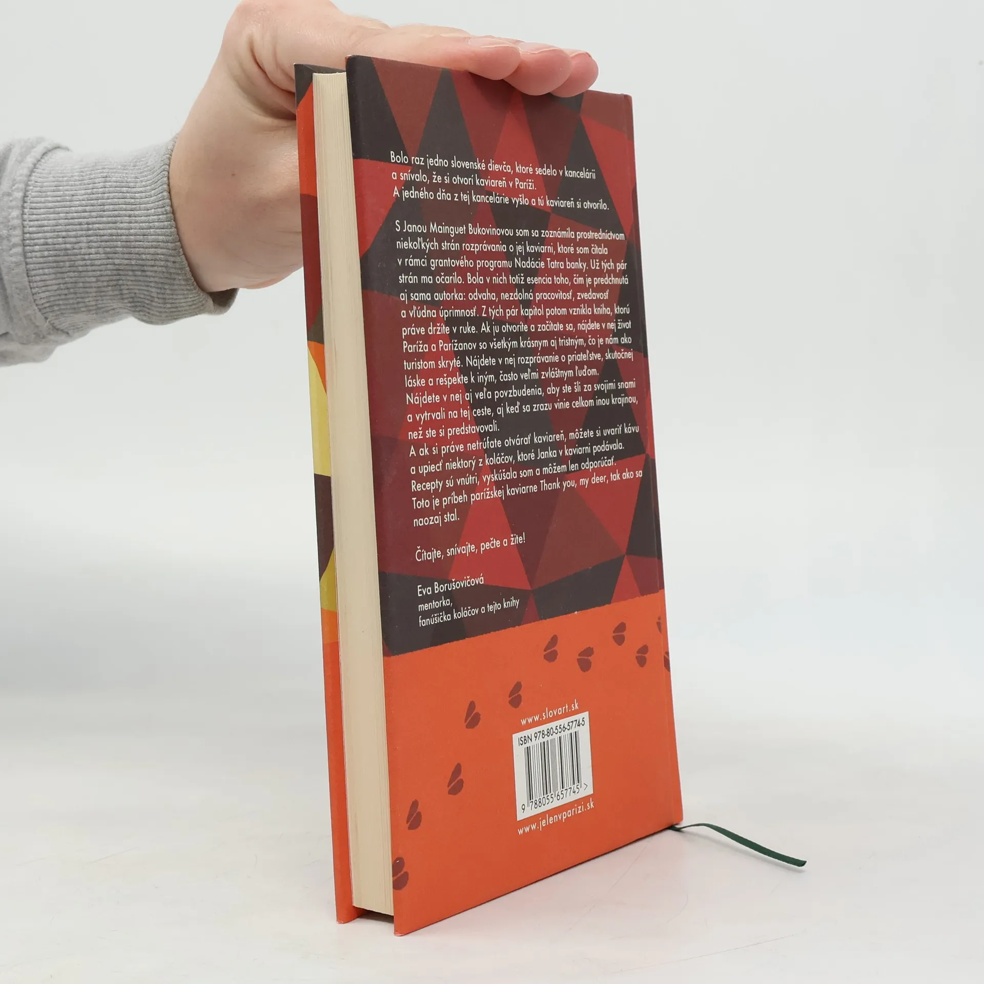 Príbeh jednej kaviarne.Jeleň v Paríži opisuje príbeh, ktorý sa naozaj stal. Je to príbeh kaviarne, ktorú si v Paríži autorka knihy otvorila a niekoľko rokov úspešne prevádzkovala. Zaznamenáva príbehy ľudí, čo v kaviarni pracovali a zanechali v nej svoju stopu, ale i príbehy hostí, susedov, priateľov, ktorí vstúpili nielen do života kaviarne, ale aj jej majiteľky. Vôňu kávy, bezlepkového chleba i koláčov z kaviarne so zvláštnym názvom Thank you, my deer zacítite i zo strán knihy. Jeleň v Paríži je príbehom o odvahe a túžbe podávať ľuďom jedlo a kávu a sledovať, ako im to robí dobre na duši, a aj o tom, že sny si treba plniť.