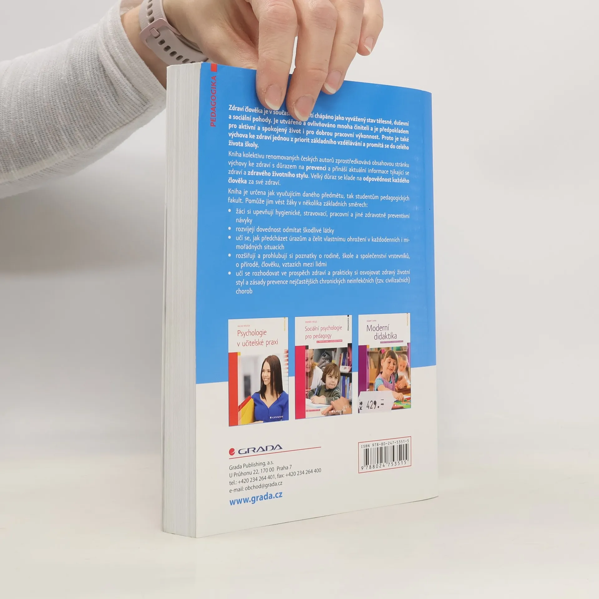 Zdraví člověka je v současném pojetí chápáno jako vyvážený stav tělesné, duševní a sociální pohody. Je utvářeno a ovlivňováno mnoha činiteli a je předpokladem pro aktivní a spokojený život i pro dobrou pracovní výkonnost. Proto je také výchova ke zdraví jednou z priorit základního vzdělávání a promítá se do celého života školy. Kniha kolektivu renomovaných českých autorů zprostředkovává obsahovou stránku výchovy ke zdraví s důrazem na prevenci a přináší aktuální informace týkající se zdraví a zdravého životního stylu. Velký důraz se klade na odpovědnost každého člověka za své zdraví. Kniha je určena jak vyučujícím daného předmětu, tak studentům pedagogických fakult. Pomůže jim vést žáky v několika základních směrech: • žáci si upevňují hygienické, stravovací, pracovní a jiné zdravotně preventivní návyky • rozvíjejí dovednost odmítat škodlivé látky • učí se, jak předcházet úrazům a čelit vlastnímu ohrožení v každodenních i mimořádných situacích • rozšiřují a prohlubují si poznatky o rodině, škole a společenství vrstevníků, o přírodě, člověku, vztazích mezi lidmi • učí se rozhodovat ve prospěch zdraví a prakticky si osvojovat zdravý životní styl a zásady prevence nejčastějších chronických neinfekčních (tzv. civilizačních) chorob