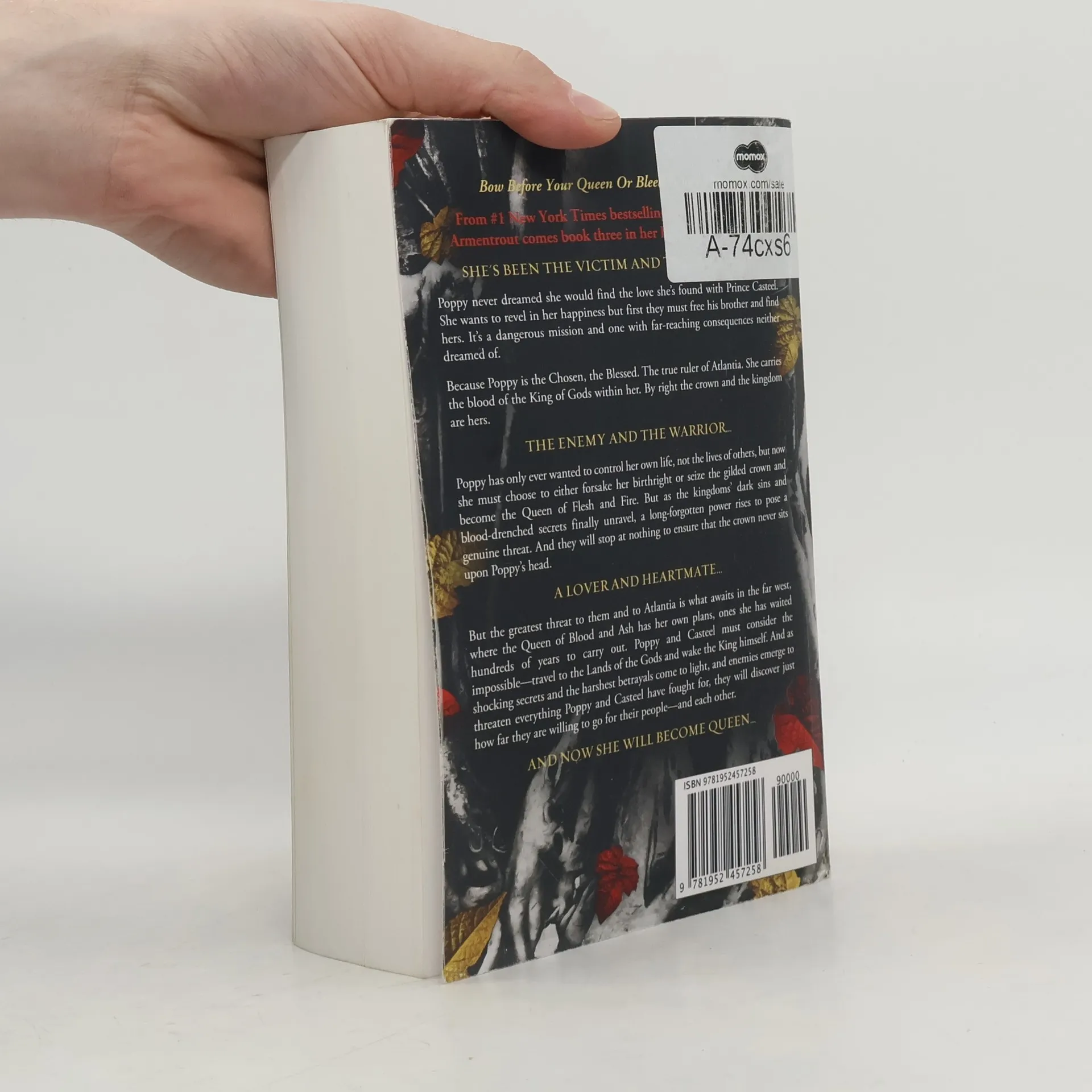 "Poppy never dreamed she would find the love she's found with Prince Casteel. She wants to revel in her happiness but first they must free his brother and find hers. It's a dangerous mission and one with far-reaching consequences neither dreamed of. Because Poppy is the Chosen, the Blessed. The true ruler of Atlantia. She carries the blood of the King of Gods within her. By right the crown and the kingdom are hers. Poppy has only ever wanted to control her own life, not the lives of others, but now she must choose to either forsake her birthright or seize the gilded crown and become the Queen of Flesh and Fire. But as the kingdoms' dark sins and blood-drenched secrets finally unravel, a long-forgotten power rises to pose a genuine threat. And they will stop at nothing to ensure that the crown never sits upon Poppy's head. But the greatest threat to them and to Atlantia is what awaits in the far west, where the Queen of Blood and Ash has her own plans, ones she has waited hundreds of years to carry out. Poppy and Casteel must consider the impossible, travel to the Lands of the Gods and wake the King himself."--Page 4 of cover
