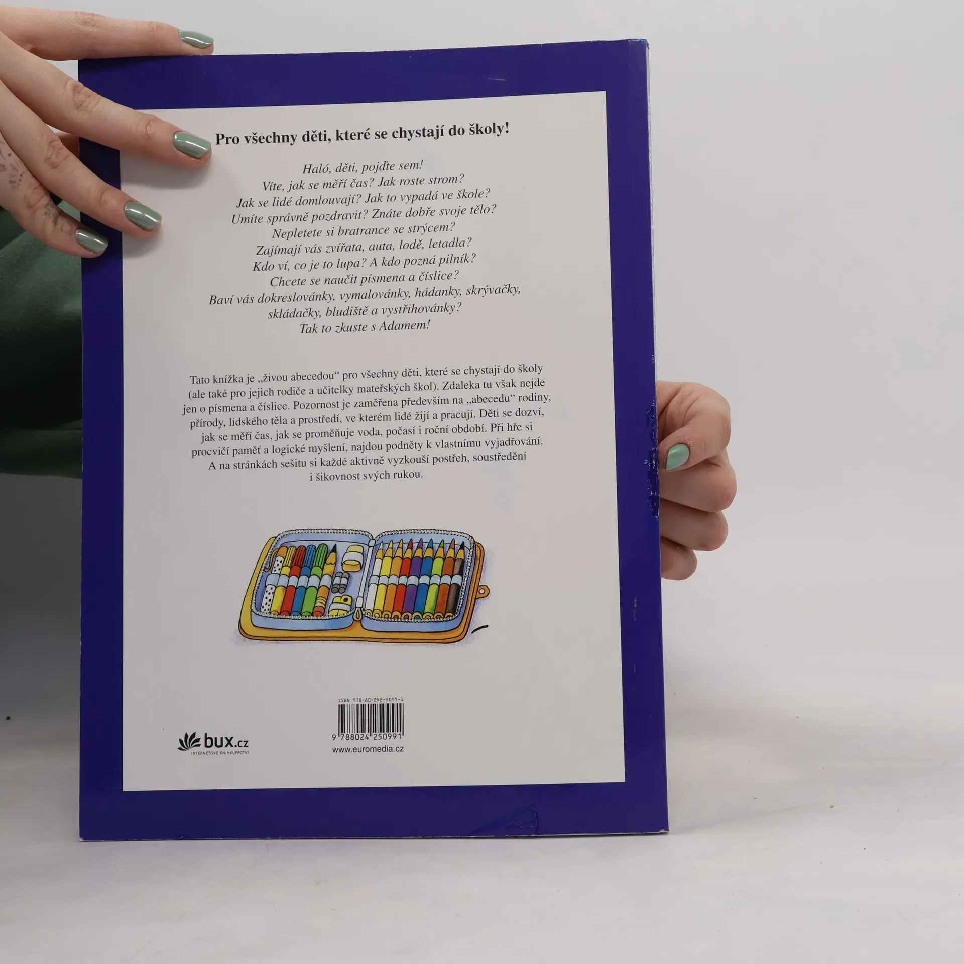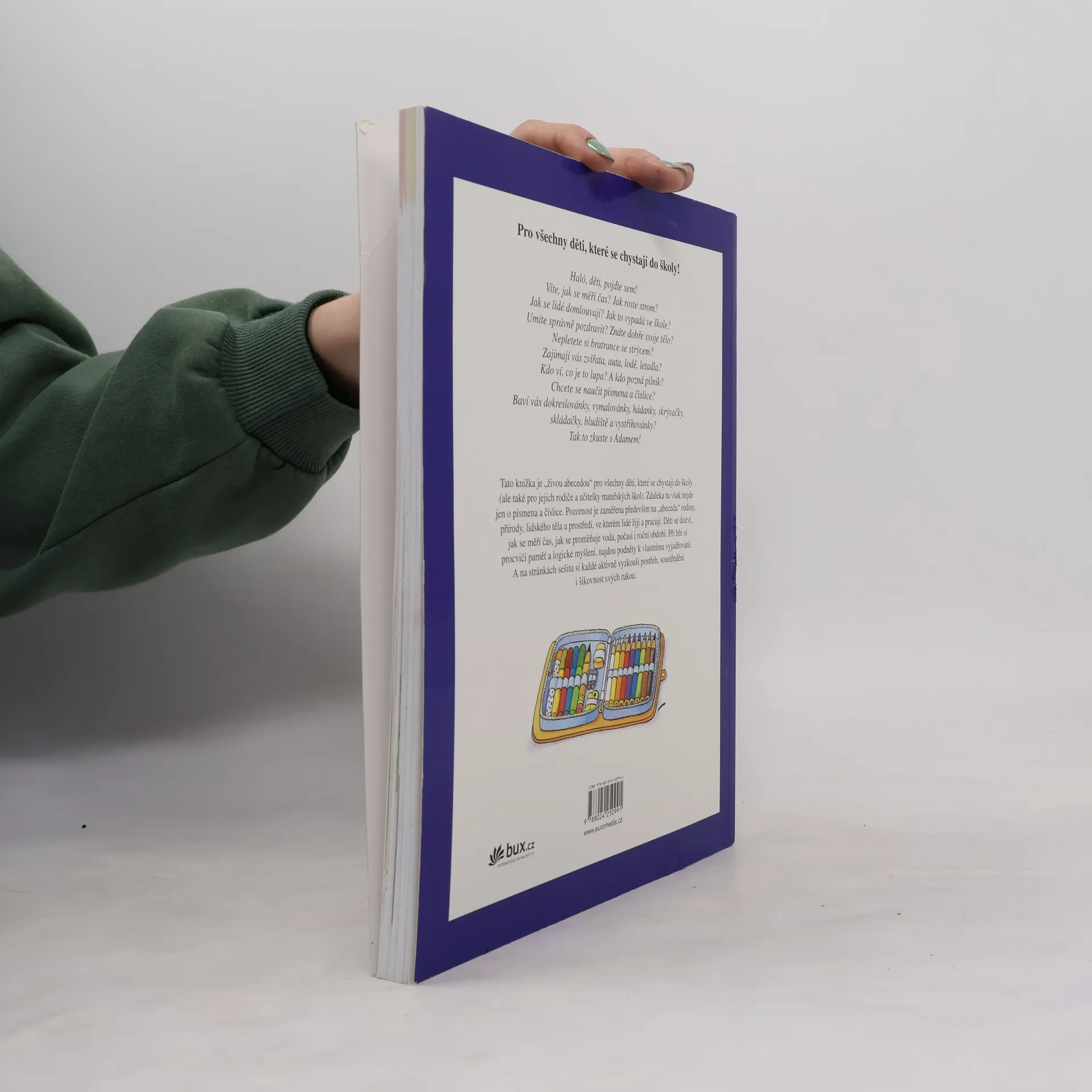 Tato knížka je "živou abecedou" pro všechny děti, které se chystají do školy (ale také pro jejich rodiče a učitelky mateřských škol). Zdaleka tu však nejde jen o písmena a číslice. Pozornost je zaměřena především na "abecedu" rodiny, přírody, lidského těla a prostředí, ve kterém lidé žijí a pracují. Děti se dozví, jak se měří čas, jak se proměňuje voda, počasí i roční období. Při hře si procvičí pamět a logické myšlení, najdou podněty k vlastnímu vyjadřování. A na stránkách sešitu si každé aktivně vyzkouší postřeh, soustředění i šikovnost svých rukou.