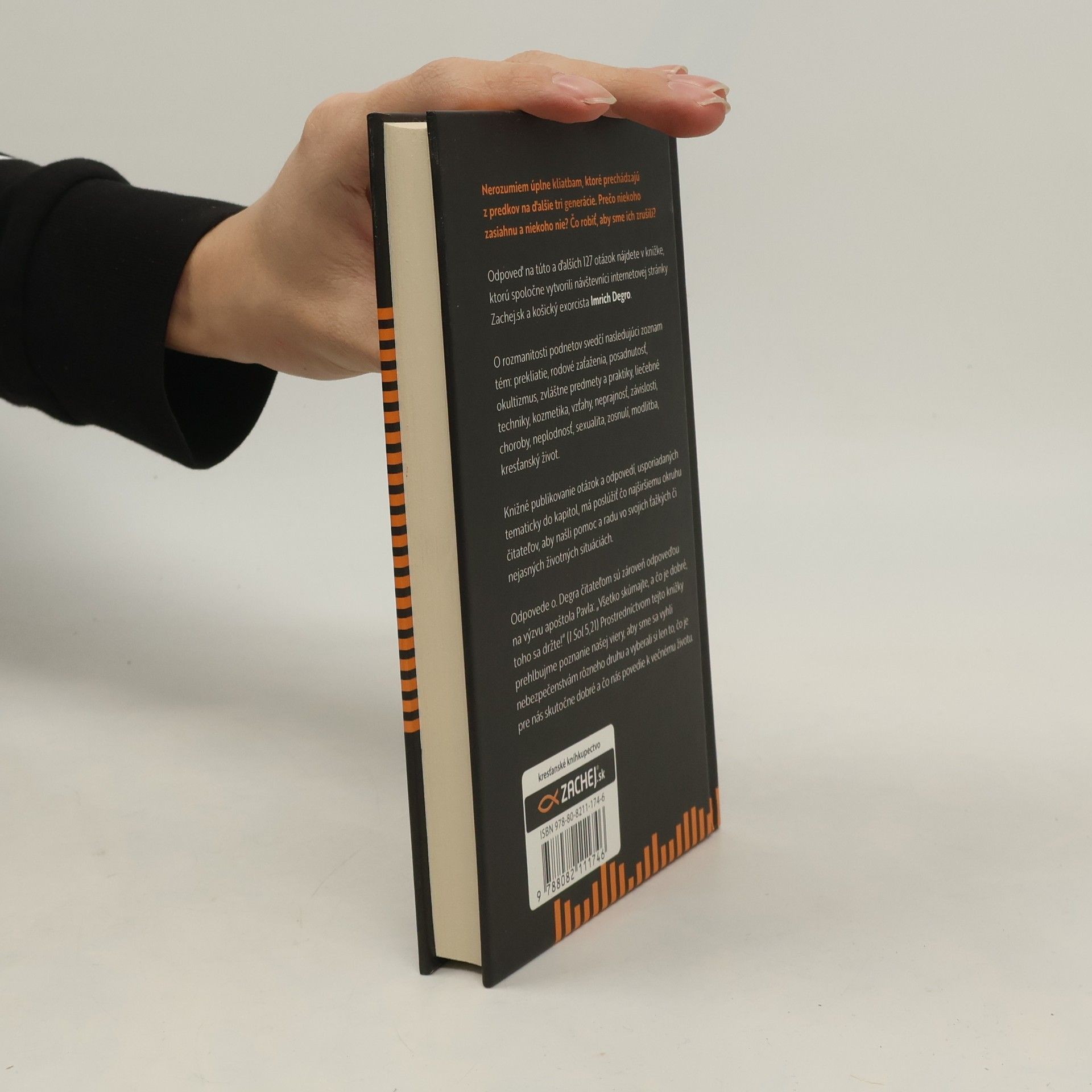 Nerozumiem celkom kliatbam, ktoré prechádzajú z predkov na ďalšie tri generácie. Prečo niekoho zasiahnu a niekoho nie? Čo robiť, aby sme ich zrušili? Odpoveď na túto a ďalších 127 otázok nájdete v knižke, ktorú spoločne vytvorili návštevníci internetovej stránky Zachej.sk a košický exorcista Imrich Degro. O rozmanitosti podnetov svedčí nasledujúci zoznam tém: prekliatie, rodové zaťaženia, posadnutosť, okultizmus, zvláštne predmety a praktiky, liečebné techniky, kozmetika, vzťahy, neprajnosť, závislosti, choroby, neplodnosť, sexualita, zosnulí, modlitba, kresťanský život. Knižné publikovanie otázok a odpovedí, usporiadaných tematicky do kapitol, má poslúžiť čo najširšiemu okruhu čitateľov, aby našli pomoc a radu vo svojich ťažkých či nejasných životných situáciách. Odpovede o. Degra čitateľom sú zároveň odpoveďou na výzvu apoštola Pavla: „Všetko skúmajte, a čo je dobré, toho sa držte!“ (1 Sol 5,21) Prostredníctvom tejto knižky prehlbujme poznanie našej viery, aby sme sa vyhli nebezpečenstvám rôzneho druhu a vyberali si len to, čo je pre nás skutočne dobré a čo nás povedie k večnému životu. Kniha je cirkevne schválená.