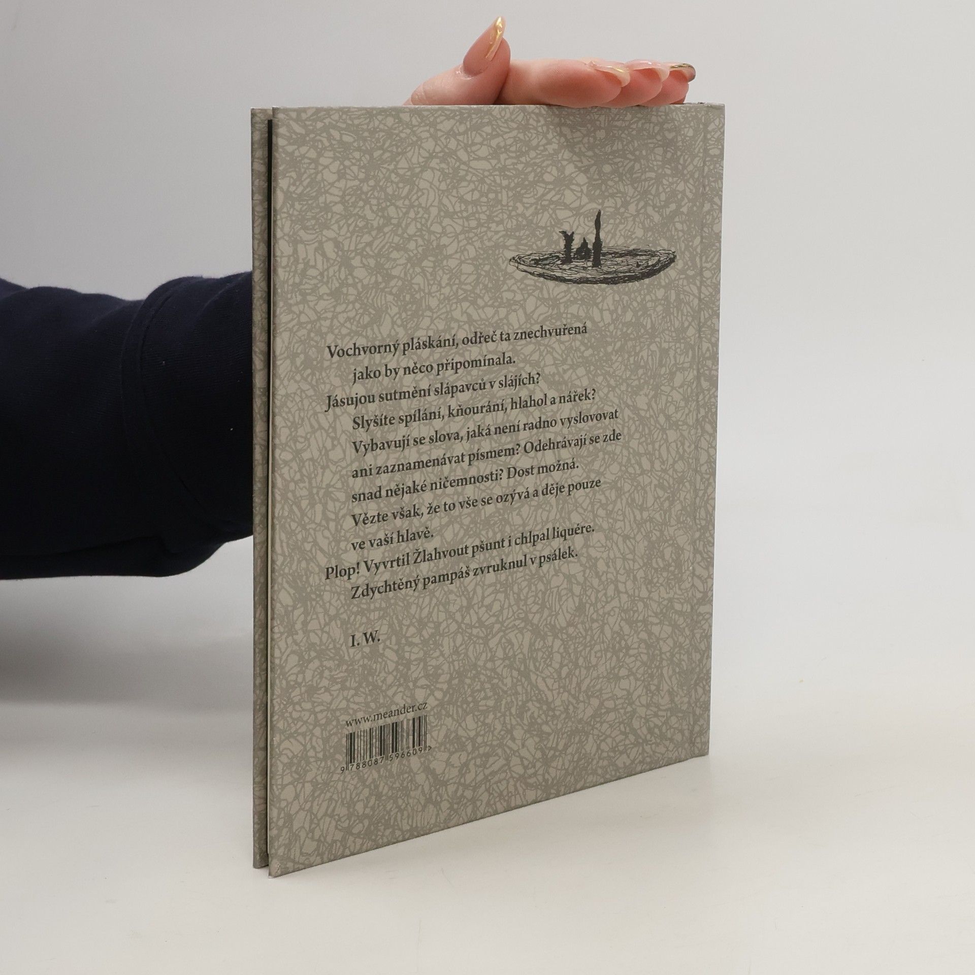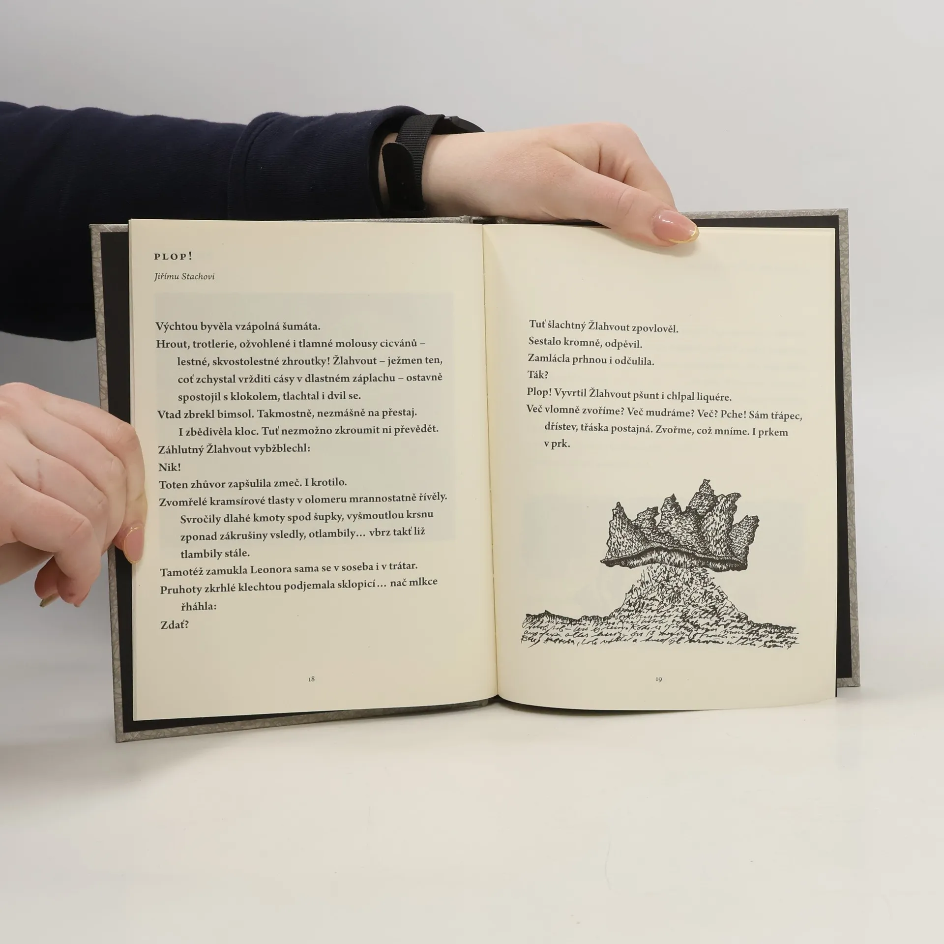 Vochvorný pláskání, odřeč ta znechvuřená jako by něco připomínala. Jásujou sutmění slápavců v slájích? Slyšíte spílání, kňourání, hlahol a nářek? Vybavují se slova, jaká není radno vyslovovat ani zaznamenávat písmem? Odehrávají se zde snad nějaké ničemnosti? Dost možná. Vězte však, že to vše se ozývá a děje pouze ve vaší hlavě. Plop! Vyvrtil Žlahvout pšunt i chlpal liquére. Zdychtěný pampáš zvruknul v psálek.