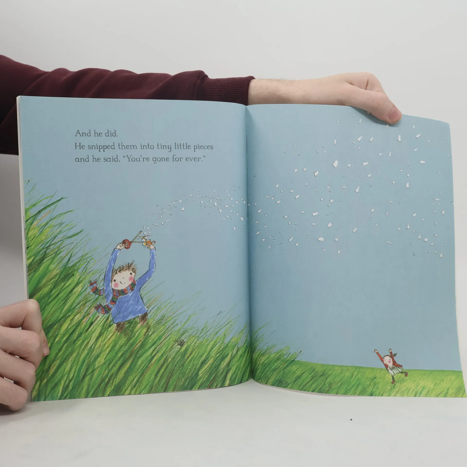 A string of paper dolls go on a fantastical adventure through the house and out into the garden. They soon escape the clutches of the toy dinosaur and the snapping jaws of the oven-glove crocodile, but then a very real pair of scissors threatens.