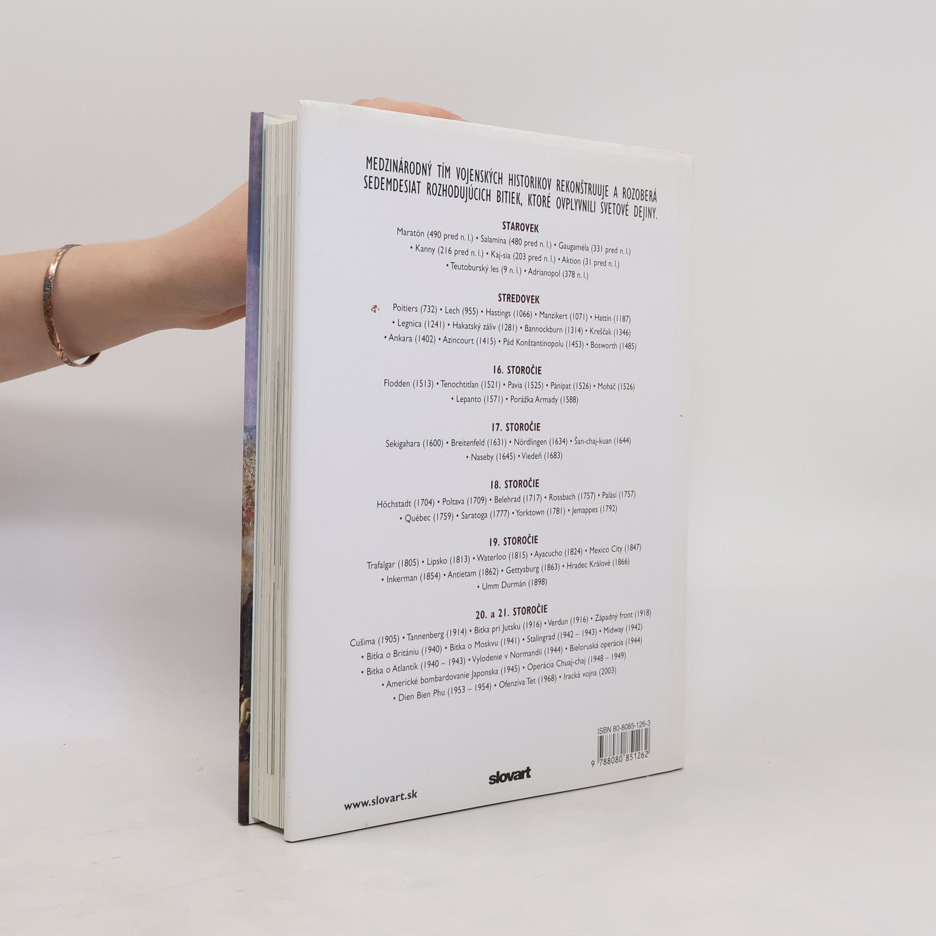 Waterloo a Gettysburg, Stalingrad a Midway, Kanny a Azincourt, ofenzíva Tet...Najnovší zväzok populárnej edície Sedemdesiat hodnotí významné bitky a vojnové konflikty v dejinách.V jednotlivých častiach knihy sa môžete dozvedieť detaily bitiek z rôznych období dejín – staroveku, stredoveku, renesancie, ale dočítate sa napríklad aj o vojnovom konflikte v Iraku.Publikácia je dokonalým prameňom informácií, bohato farebne ilustrovaným, so stovkami fotografií a dobových malieb a s osobitne spracovanými schémami bitiek. Je dostatočne zaujímavá pre širšie čitateľske publikum, nielen pre tých, čo sa zaujímajú striktne o vojenské dejiny.