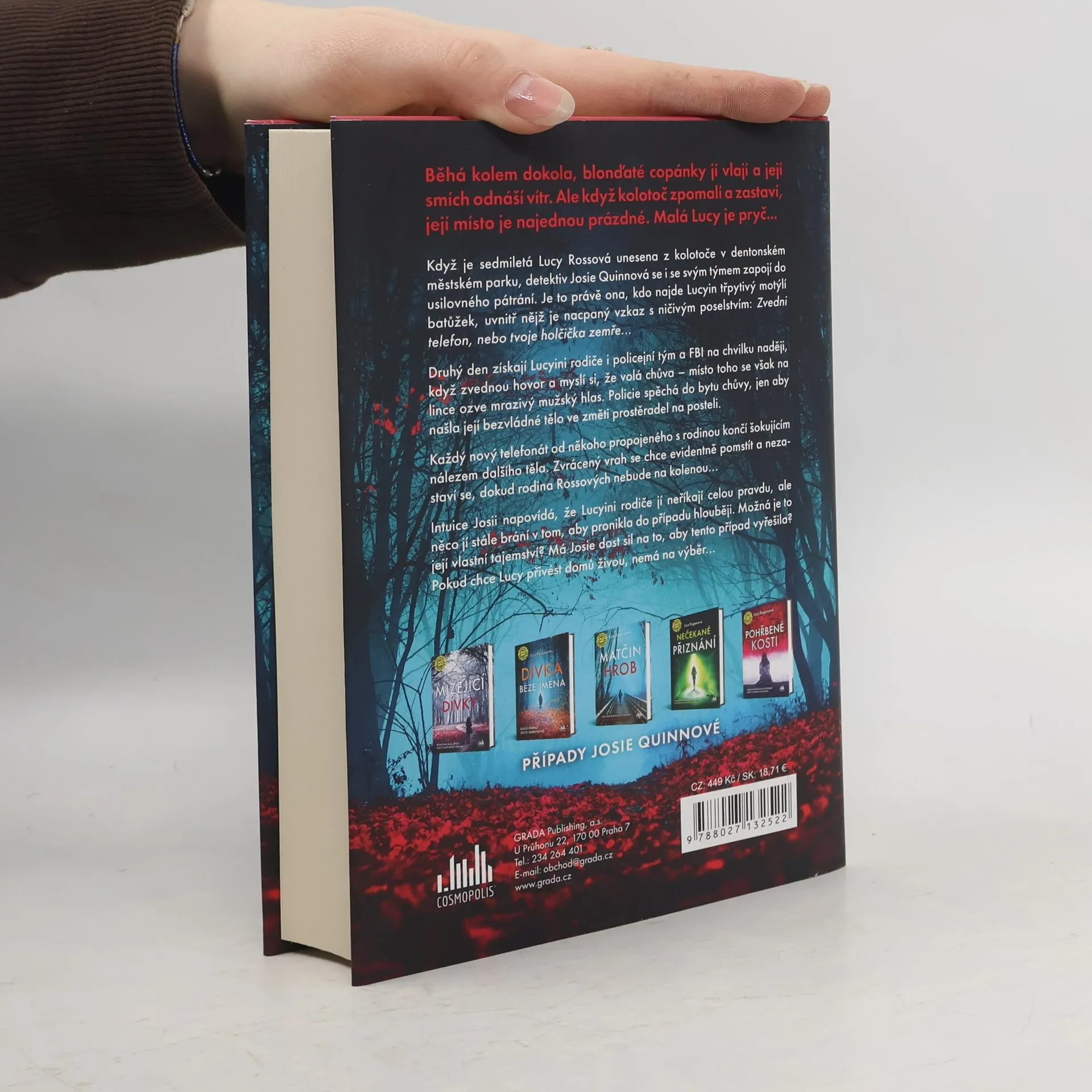 Když je sedmiletá Lucy Rossová unesena z kolotoče v dentonském městském parku, detektiv Josie Quinnová se i se svým týmem zapojí do usilovného pátrání. Je to právě ona, kdo najde Lucyin třpytivý motýlí batůžek, uvnitř nějž je nacpaný vzkaz s ničivým poselstvím: Zvedni telefon, nebo tvoje holčička zemře... Druhý den získají Lucyini rodiče i policejní tým a FBI na chvilku naději, když zvednou hovor a myslí si, že volá chůva – místo toho se však na lince ozve mrazivý mužský hlas. Policie spěchá do bytu chůvy, jen aby našla její bezvládné tělo ve změti prostěradel na posteli. Každý nový telefonát od někoho propojeného s rodinou končí šokujícím nálezem dalšího těla. Zvrácený vrah se chce evidentně pomstít a nezastaví se, dokud rodina Rossových nebude na kolenou... Intuice Josii napovídá, že Lucyini rodiče jí neříkají celou pravdu, ale něco jí stále brání v tom, aby pronikla do případu hlouběji. Možná je to její vlastní tajemství? Má Josie dost sil na to, aby tento případ vyřešila? Pokud chce Lucy přivést domů živou, nemá na výběr...