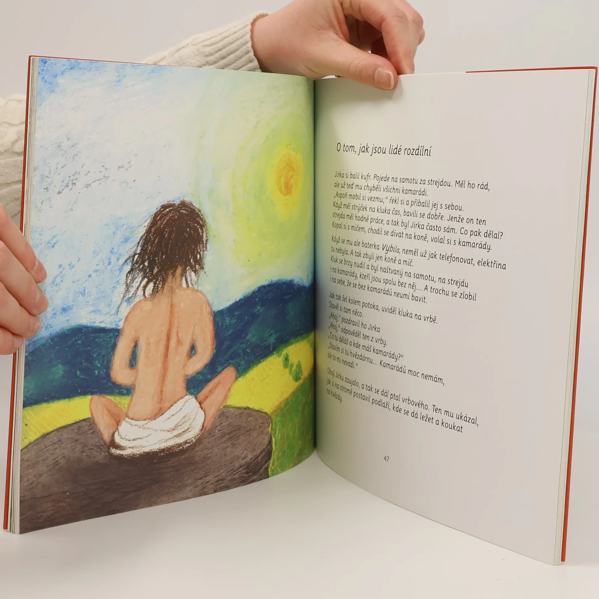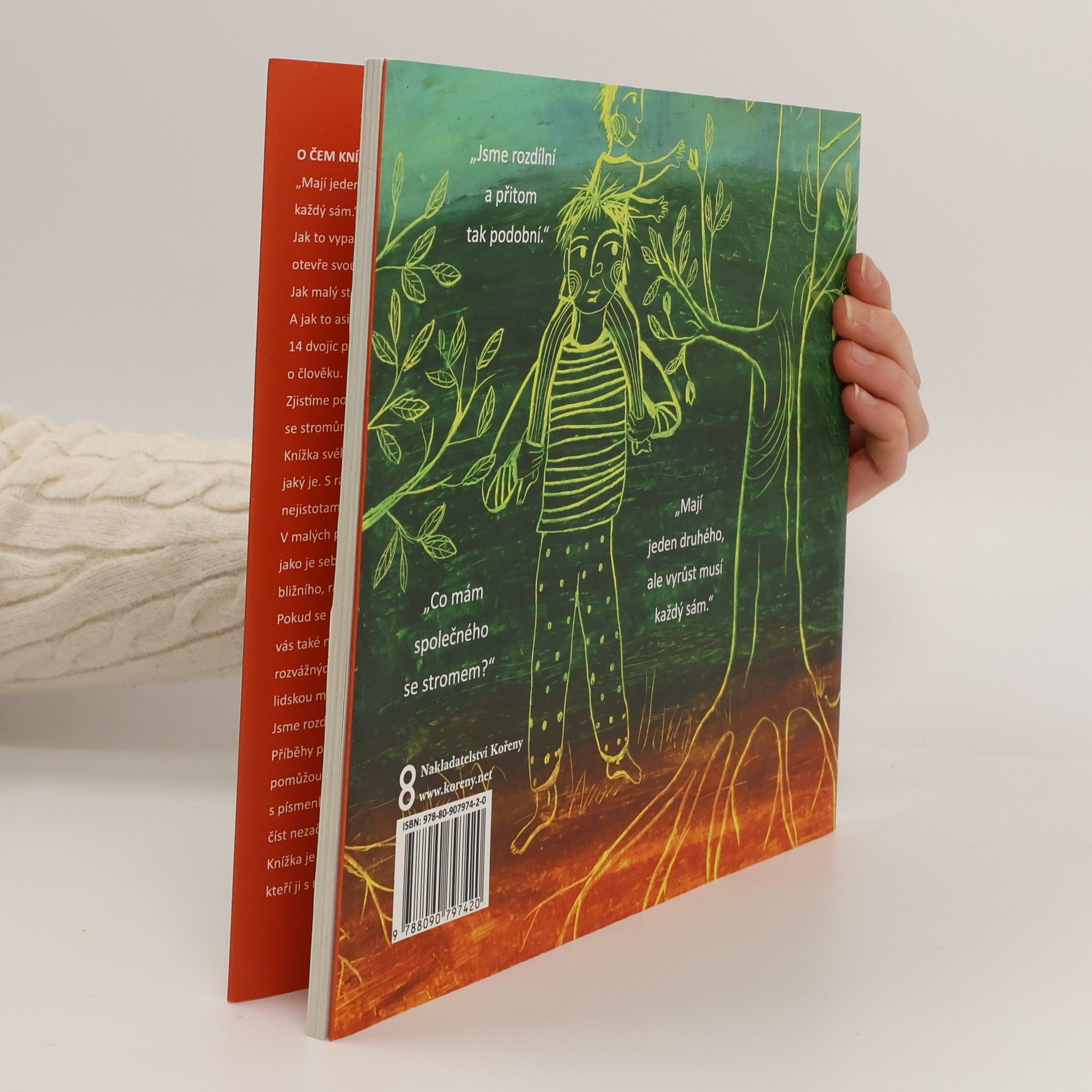 Mají jeden druhého, ale vyrůst musí každý sám. Jak to vypadá, když člověk nebo strom otevře svou náruč nebo když se začervená? Jak malý stromek ví, co má dělat? A jak to asi ví miminko v bříšku? 14 dvojic příběhů s podobným koncem, jeden o stromu, druhý o člověku. V čem se stromům podobáme? Knížka svého čtenáře přijímá takového, jaký je. S radostmi, ale i s jeho životními nejistotami... V malých příbězích se otevírají velká témata jako je sebehodnota, strach ze ztráty bližního nebo život v přítomnosti. Pokud se rádi touláte přírodou, třeba vás také napadají zapletky mezi větvemi rozvážných stromů a těkavou lidskou maličkostí. Jsme rozdílní a přece podobní... Příběhy psané přehledným písmem pomohou dětem s prvním čtením a hrátky s písmenky upoutají i děti, které ještě číst nezačaly. Knížka je psána pro děti od 5 let a všechny, kteří ji s nimi budou číst.