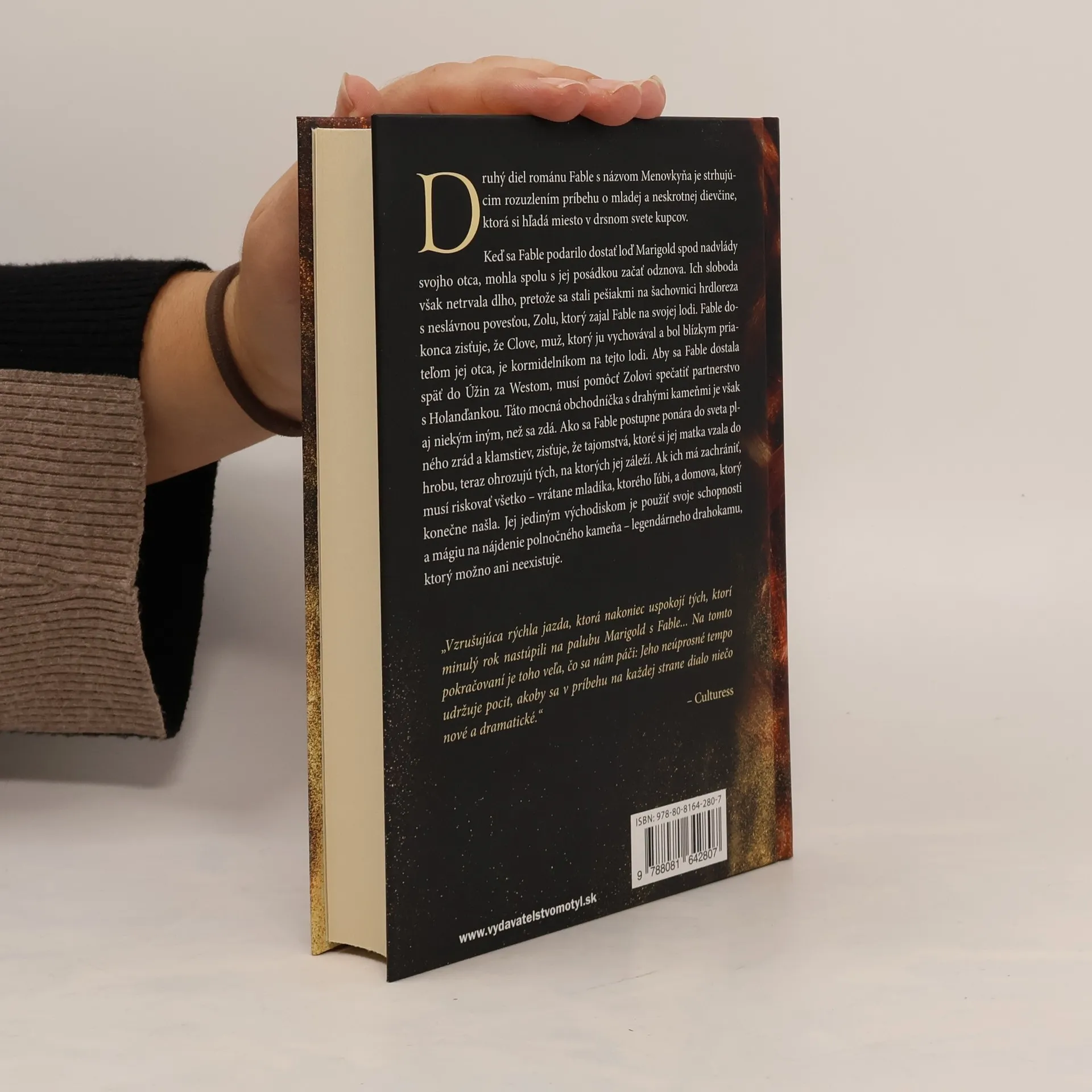 Druhý diel románovej duológie Fable s názvom Menovkyňa je strhujúcim rozuzlením príbehu o mladej a neskrotnej dievčine, ktorá si hľadá miesto v drsnom svete kupcov. Keď sa Fable podarilo dostať loď Marigold spod nadvlády svojho otca, mohla spolu s jej posádkou začať odznova. Ich sloboda však netrvala dlho, pretože sa stali pešiakmi na šachovnici hrdloreza s neslávnou povesťou, Zolu, ktorý zajal Fable na svojej lodi. Fable dokonca zisťuje, že Clove, muž, ktorý ju vychovával a bol blízkym priate ľom jej otca, je kormidelníkom na tejto lodi. Aby sa Fable dostala späť do Úžin za Westom, musí pomôcť Zolovi spečatiť partnerstvo s Holanďankou. Táto mocná obchodníčka s drahými kameňmi je však aj niekým iným, než sa zdá. Ako sa Fable postupne ponára do sveta plného zrád a klamstiev, zisťuje, že tajomstvá, ktoré si jej matka vzala do hrobu, teraz ohrozujú tých, na ktorých jej záleží. Ak ich má zachrániť, musí riskovať všetko- vrátane mladíka, ktorého ľúbi, a domova, ktorý konečne našla. Jej jediným východiskom je použiť svoje schopnosti a mágiu na nájdenie polnočného kameňa– legendárneho drahokamu, ktorý možno ani neexistuje.
