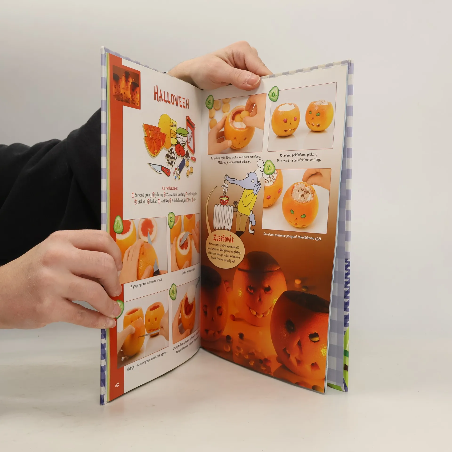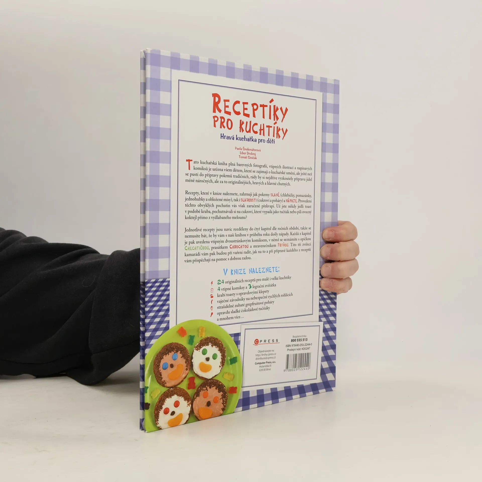 Tato kuchařská kniha plná barevných fotografií, vtipných ilustrací a napínavých komiksů je určena všem dětem, které se zajímají o kuchařské umění, ale ještě než se pustí do přípravy pokrmů tradičních, rády by si nejdříve vyzkoušely přípravu jídel méně náročných, ale za to originálnějších, hravých a hlavně chutných. Recepty, které v knize naleznete, zahrnují jak pokrmy slané (chlebíčky, pomazánky, jednohubky a obložené mísy), tak i sladkosti (cukroví a poháry) a nápoje. Provedení těchto obvyklých pochutin vás však zaručeně překvapí. Už jste někdy jedli toast v podobě kraba, pochutnávali si na cukroví, které vypadá jako tučňák nebo pili ovocný koktejl přímo z vydlabaného melounu? Jednotlivé recepty jsou navíc rozděleny do čtyř kapitol dle ročních období, takže se nemusíte bát, že by vám s naší knihou v průběhu roku došly nápady. Každá z kapitol je pak uvedena vtipným dvoustránkovým komiksem, v němž se seznámíte s opičkou Chechtičkou, prasátkem Chrochtou a mravenečníkem Frfňou. Tito tři zvířecí kamarádi vám pak budou při vaření radit, jak na to a při přípravě každého z receptů vám přispěchají na pomoc s dobrou radou.