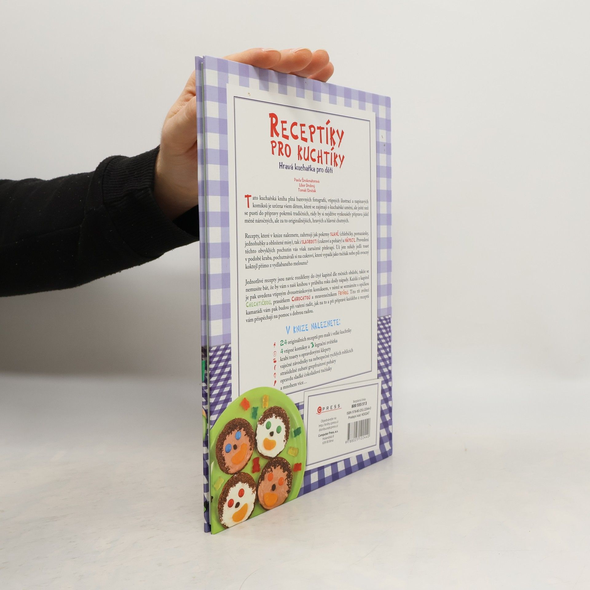 Tato kuchařská kniha plná barevných fotografií, vtipných ilustrací a napínavých komiksů je určena všem dětem, které se zajímají o kuchařské umění, ale ještě než se pustí do přípravy pokrmů tradičních, rády by si nejdříve vyzkoušely přípravu jídel méně náročných, ale za to originálnějších, hravých a hlavně chutných. Recepty, které v knize naleznete, zahrnují jak pokrmy slané (chlebíčky, pomazánky, jednohubky a obložené mísy), tak i sladkosti (cukroví a poháry) a nápoje. Provedení těchto obvyklých pochutin vás však zaručeně překvapí. Už jste někdy jedli toast v podobě kraba, pochutnávali si na cukroví, které vypadá jako tučňák nebo pili ovocný koktejl přímo z vydlabaného melounu? Jednotlivé recepty jsou navíc rozděleny do čtyř kapitol dle ročních období, takže se nemusíte bát, že by vám s naší knihou v průběhu roku došly nápady. Každá z kapitol je pak uvedena vtipným dvoustránkovým komiksem, v němž se seznámíte s opičkou Chechtičkou, prasátkem Chrochtou a mravenečníkem Frfňou. Tito tři zvířecí kamarádi vám pak budou při vaření radit, jak na to a při přípravě každého z receptů vám přispěchají na pomoc s dobrou radou.
