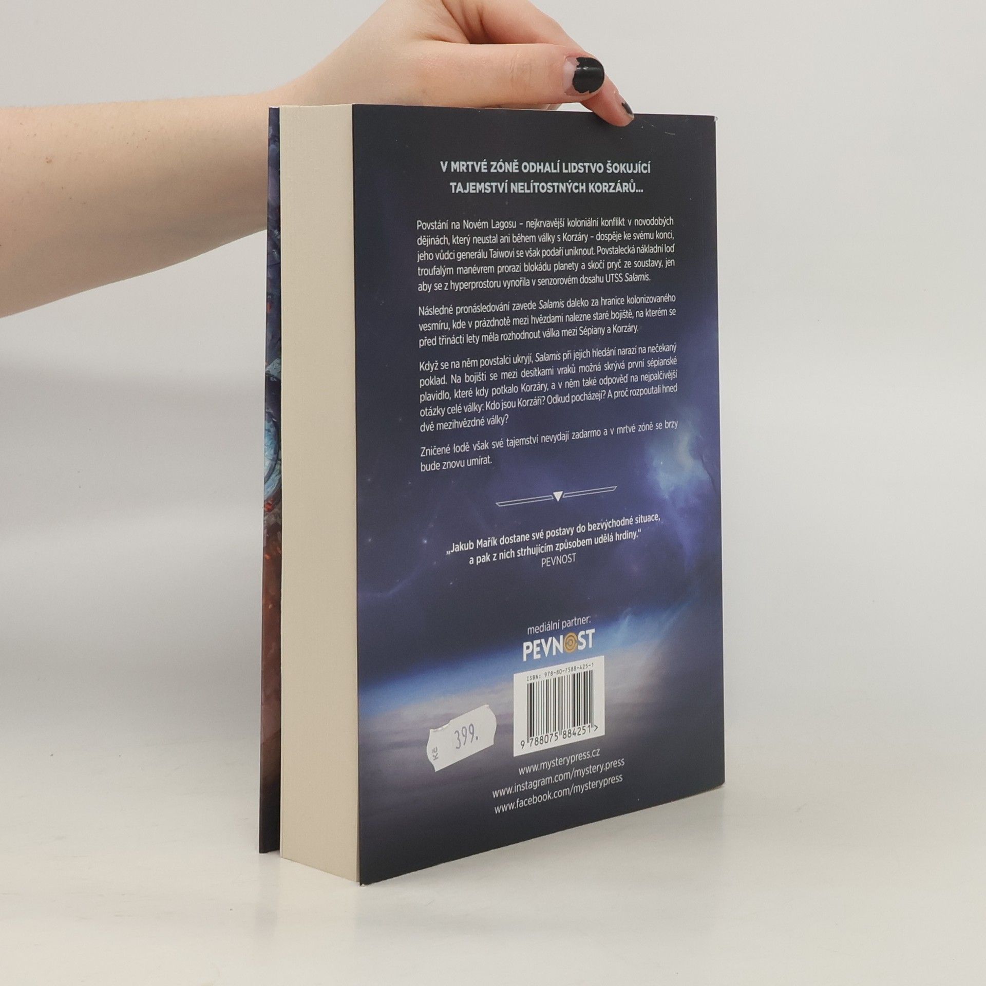 V MRTVÉ ZÓNĚ ODHALÍ LIDSTVO ŠOKUJÍCÍ TAJEMSTVÍ NELÍTOSTNÝCH KORZÁRŮ…Povstání na Novém Lagosu – nejkrvavější koloniální konflikt v novodobých dějinách, který neustal ani během války s Korzáry – dospěje ke svému konci, jeho vůdci generálu Taiwovi se však podaří uniknout. Povstalecká nákladní loď troufalým manévrem prorazí blokádu planety a skočí pryč ze soustavy, jen aby se z hyperprostoru vynořila v senzorovém dosahu UTSS Salamis.Následné pronásledování zavede Salamis daleko za hranice kolonizovaného vesmíru, kde v prázdnotě mezi hvězdami nalezne staré bojiště, na kterém se před třinácti lety měla rozhodnout válka mezi Sépiany a Korzáry. Když se na něm povstalci ukryjí, Salamis při jejich hledání narazí na nečekaný poklad. Na bojišti se mezi desítkami vraků možná skrývá první sépianské plavidlo, které kdy potkalo Korzáry, a v něm také odpověď na nejpalčivější otázky celé války: Kdo jsou Korzáři? Odkud pocházejí? A proč rozpoutali hned dvě mezihvězdné války?Zničené lodě však své tajemství nevydají zadarmo a v mrtvé zóně se brzy bude znovu umírat._________________„Jakub Mařík dostane své postavy do bezvýchodné situace, a pak z nich strhujícím způsobem udělá hrdiny.“ – PEVNOST