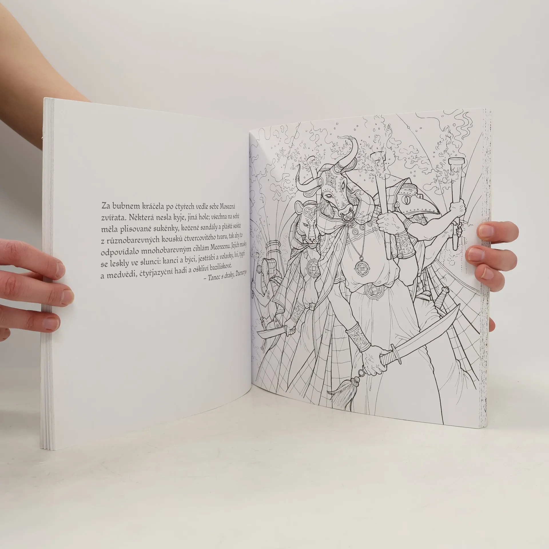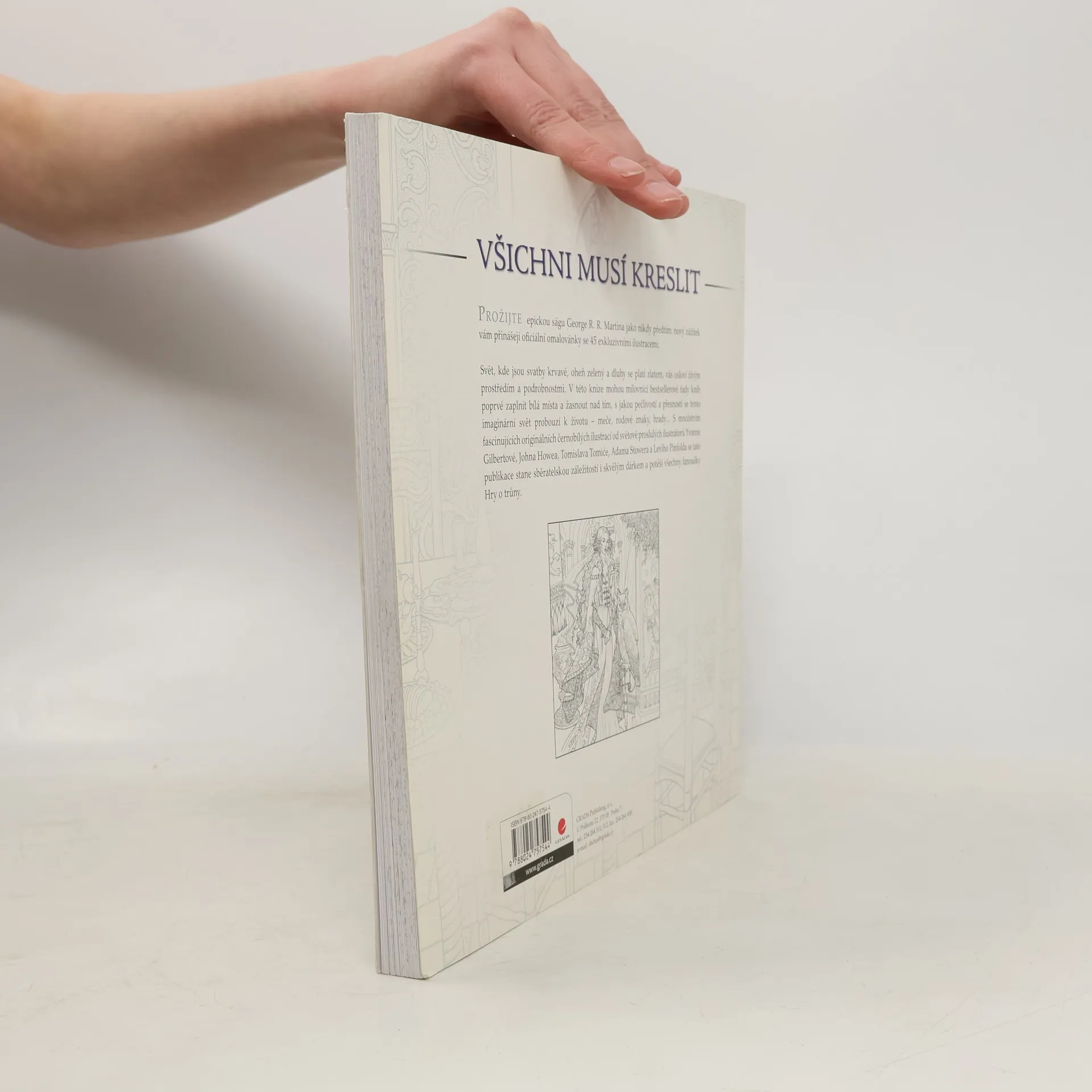Svět, kde jsou svatby krvavé, oheň zelený a dluhy se platí zlatem, vás osloví živým prostředím a podrobnostmi. V této knize omalovánek mohou milovníci bestsellerové řady knih poprvé zaplnit bílá místa podle své představivosti a žasnout nad tím, s jakou pečlivostí a přesností se tento fantastický svět probouzí k životu – meče, rodové znaky, draci, výjevy z knihy. To vše a ještě mnohem více proložené citáty z knih, díky kterým si dané scény snadno vybavíte. S množstvím fascinujících originálních černobílých ilustrací od světově proslulých ilustrátorů Yvonne Gilbertové, Johna Howea, Tomislava Tomiće, Adama Stowera a Leviho Pinfolda se tato publikace stane sběratelskou záležitostí i skvělým dárkem a potěší všechny fanoušky Hry o trůny. Dejte příběhům z pera George R. R. Martina svůj osobitý styl. Vytvořte si svůj vlastní svět a výjevům z knihy dejte nádech podle vaší aktuální nálady.