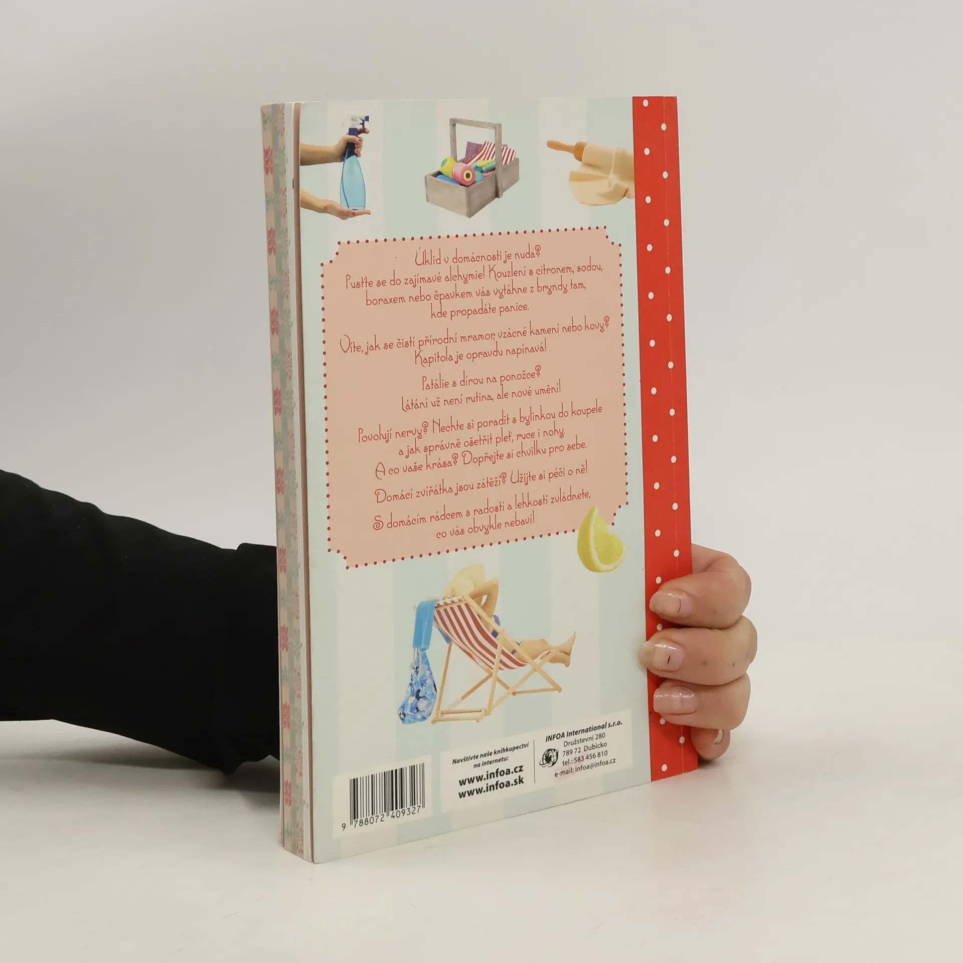 Úklid v domácnosti je nuda? Pusťte se do zajímavé alchymie! Kouzlení s citronem, sodou, boraxem nebo čpavkem vás vytáhne z bryndy tam, kde propadáte panice. Víte, jak se čistí přírodní mramor, vzácné kamení nebo kovy? Kapitola je opravdu napínavá! Patálie s dírou v ponožce? Látání už není rutina, ale nové umění! Povolují nervy? Nechte si poradit s bylinkou do koupele a jak správně ošetřit pleť, ruce i nohy. A co vaše krása? Dopřejte si chvilku pro sebe. Domácí zvířátka jsou zátěží? Užijte si péči o ně! S domácím rádcem s radostí a lehkostí zvládnete, co vás obvykle nebaví.