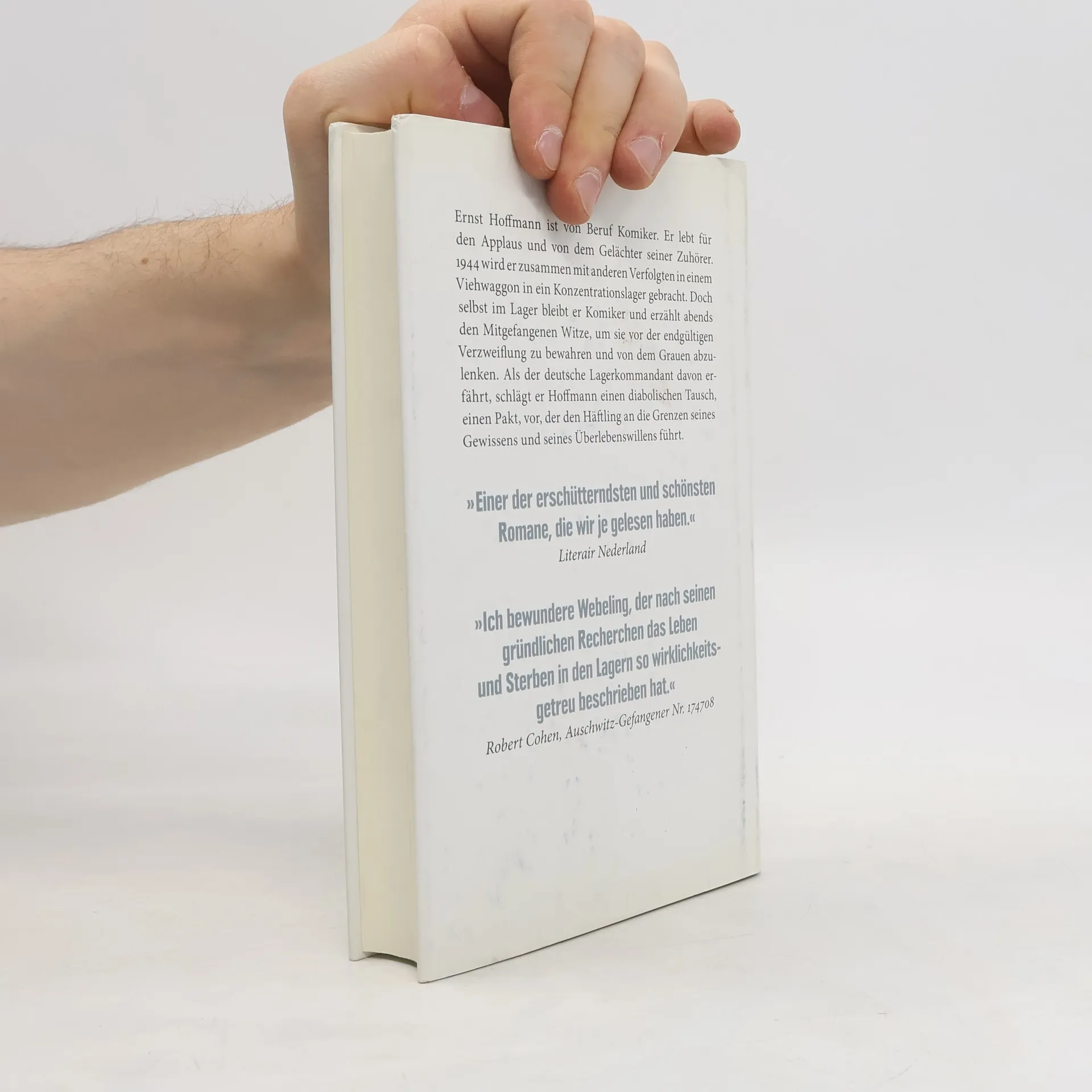 Der Held und Ich-Erzähler dieses Romans, Ernst Hofman aus Amsterdam, ist von Beruf Komiker. Er lebt für den Applaus und von dem Gelächter seiner Zuhörer. Da seine verstorbene Mutter Jüdin war und er mit politischen Witzen auffällig geworden ist, wird er 1944 in einem Viehwaggon mit anderen Verfolgten in ein Konzentrationslager gebracht. Doch Ernst Hofman kann nicht anders, er bleibt selbst im Lager Komiker und erzählt, mit Billigung des Barackenältesten, abends den Mitgefangenen Witze, um sie vor der endgültigen Verzweiflung zu bewahren und von dem Grauen abzulenken. Als der deutsche Lagerkommandant das erfährt, will er Hofman dazu bringen, abends vor den SS-Leuten als Kabarettist aufzutreten. Erst weigert sich der Komiker, doch dann verspricht ihm der Lagerkommandant, die Frau, in die sich Hofman auf dem Transport verliebt hat, am Leben zu lassen. Es ist ein diabolischer Vorschlag, der den Häftling an die Grenzen seines Gewissens und seines Überlebenswillens führt.