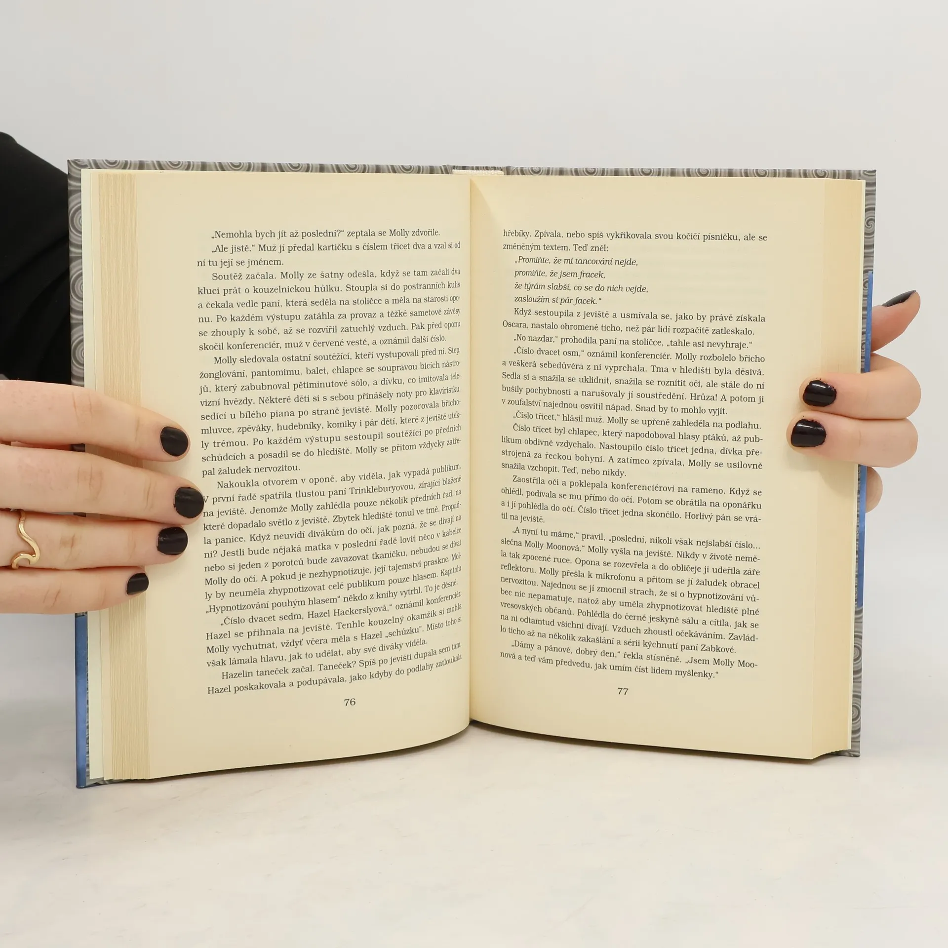 Příběh Molly, chovanky sirotčince, jejíž život dočista změní náhodný objev tajemné knihy o hypnotismu. Knížka je vhodná pro starší děti. Molly nemá příliš radostné dětství. Žije v malém městečku Vresová v sirotčinci Skuhrov, kde vládne přísnou rukou vychovatelka Zmiykalová a v kuchyni se vaří ty nejnechutnější pokrmy. Ani mezi dětmi nemá děvčátko mnoho přátel. Snad jen Rockyho. Ten však jednoho dne nečekaně nalézá adoptivní rodiče a Skuhrov opouští. Molly však přece jen nezůstává zcela osamocena. V tu chvíli už má totiž ve svých rukou úžasnou knihu, s jejíž pomocí se začíná učit hypnotizovat. Brzy zjišťuje, že opravdu dokáže ovlivňovat vědomí zvířat i lidí. Molly však není jediná osoba, která se o knihu zajímá. Dosti usilovně po ní pátrá také tajemný muž z Ameriky.