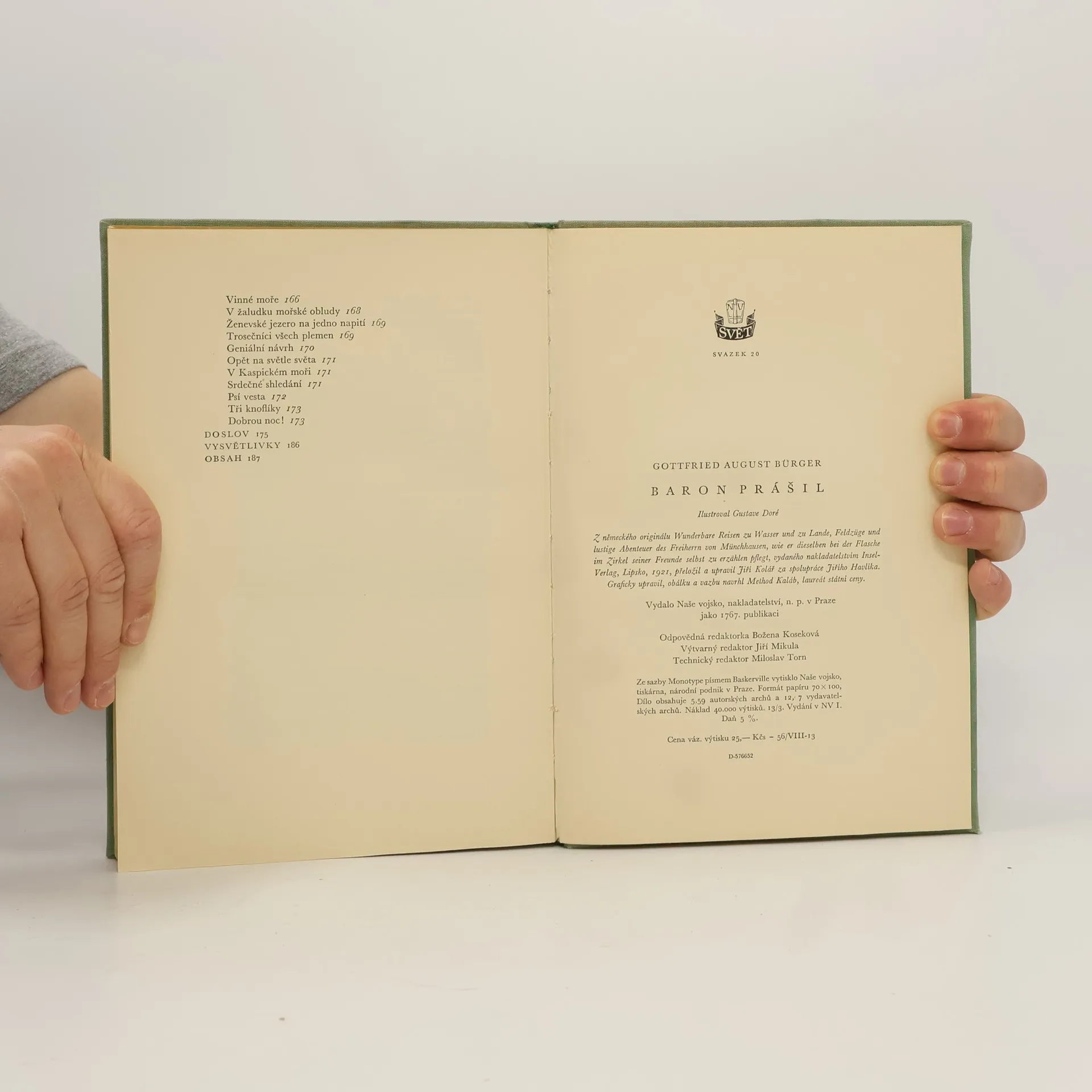 Svět chce být klamán, říká známé přísloví a kdoví, zda není jeho tvůrcem sám baron Prášil, nekorunovaný král všech lhářů. Byl-li pan baron z Münchhausenu - česky baron Prášil notorický lhář a šejdíř či jen blouznivý fantasta a rozený řečník, bohužel nevíme. Tak jako Haškův "Dobrý voják Švejk" by nebyl bez Švejkem bez Lady, tak pro dnešního čtenáře, citlivého stejně na obsah i úpravu knihy, přispívá k přitažlivosti a kouzlu historek prolhaného barona stejnou měrou i grafický doprovod Gustava Doré, nejpopulárnějšího z romantických ilustrátorů. Přeložil Jiří Kolář. Vydala Academia roku 2000, edice Reprint.