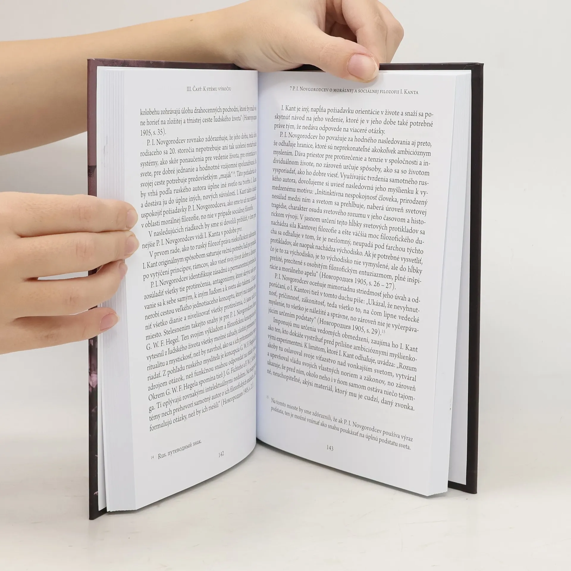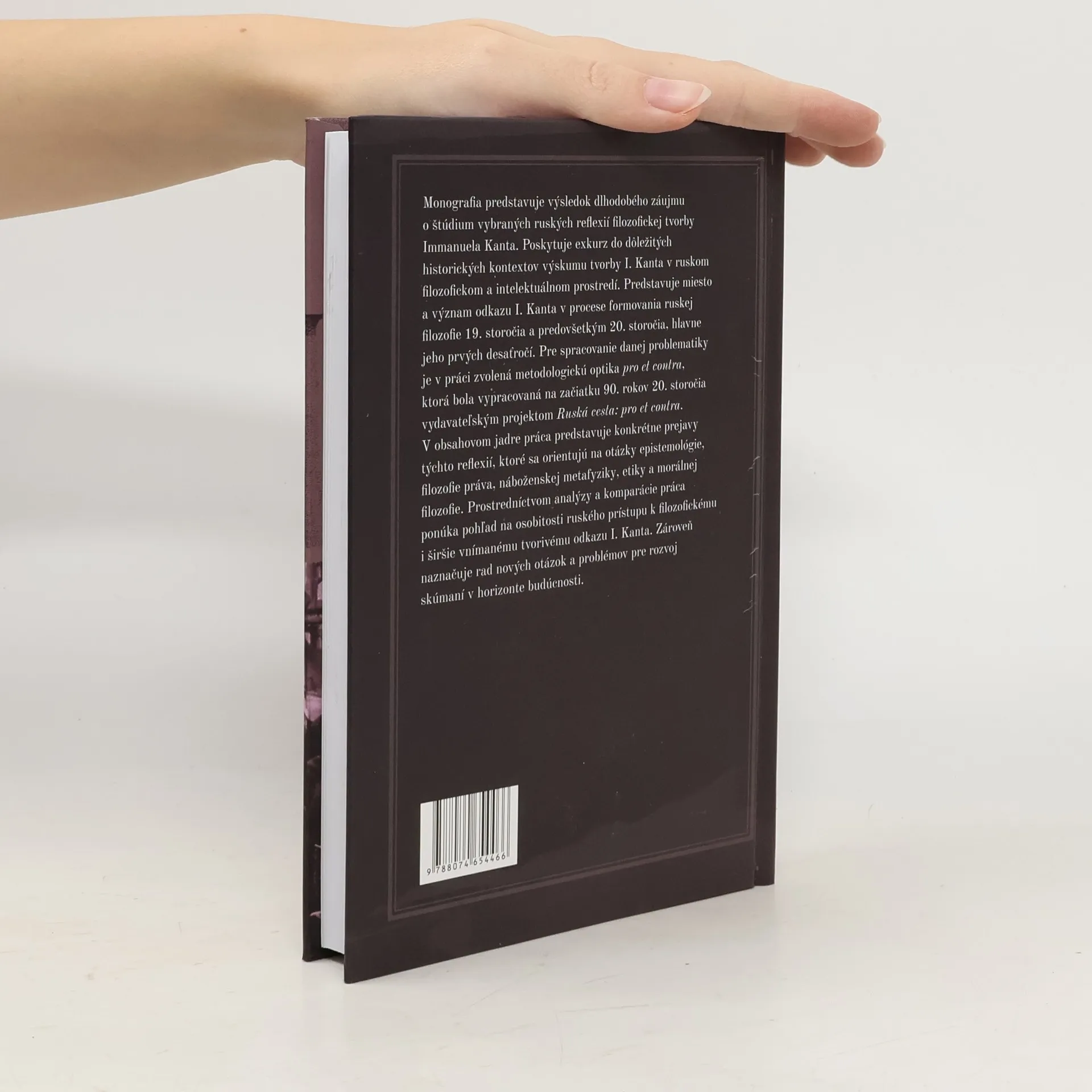 Monografia predstavuje výsledok dlhodobého záujmu o štúdium vybraných ruských reflexií filozofickej tvorby Immanuela Kanta. Poskytuje exkurz do dôležitých historických kontextov výskumu tvorby I. Kanta v ruskom filozofickom a intelektuálnom prostredí. Predstavuje miesto a význam odkazu I. Kanta v procese formovania ruskej filozofie 19. storočia a predovšetkým 20. storočia, hlavne jeho prvých desaťročí. Pre spracovanie danej problematiky je v práci zvolená metodologickú optika pro et contra, ktorá bola vypracovaná na začiatku 90. rokov 20. storočia vydavateľským projektom Ruská cesta: pro et contra. V obsahovom jadre práca predstavuje konkrétne prejavy týchto reflexií, ktoré sa orientujú na otázky epistemológie, filozofie práva, náboženskej metafyziky, etiky a morálnej filozofie. Prostredníctvom analýzy a komparácie práca ponúka pohľad na osobitosti ruského prístupu k filozofickému i širšie vnímanému tvorivému odkazu I. Kanta. Zároveň naznačuje rad nových otázok a problémov pre rozvoj skúmaní v horizonte budúcnosti.