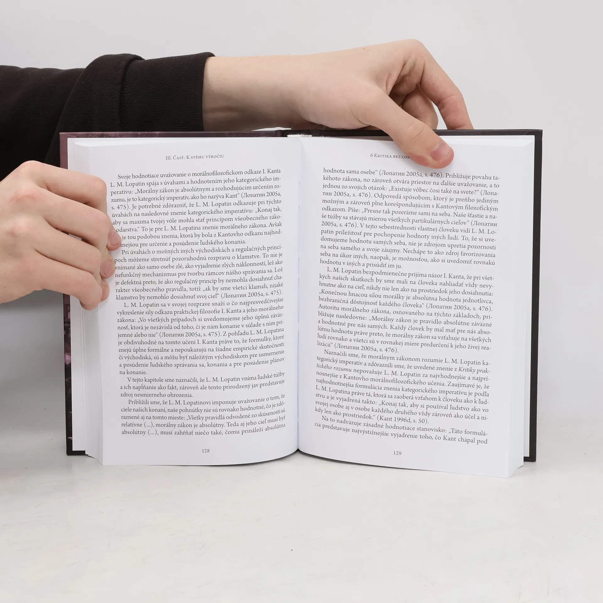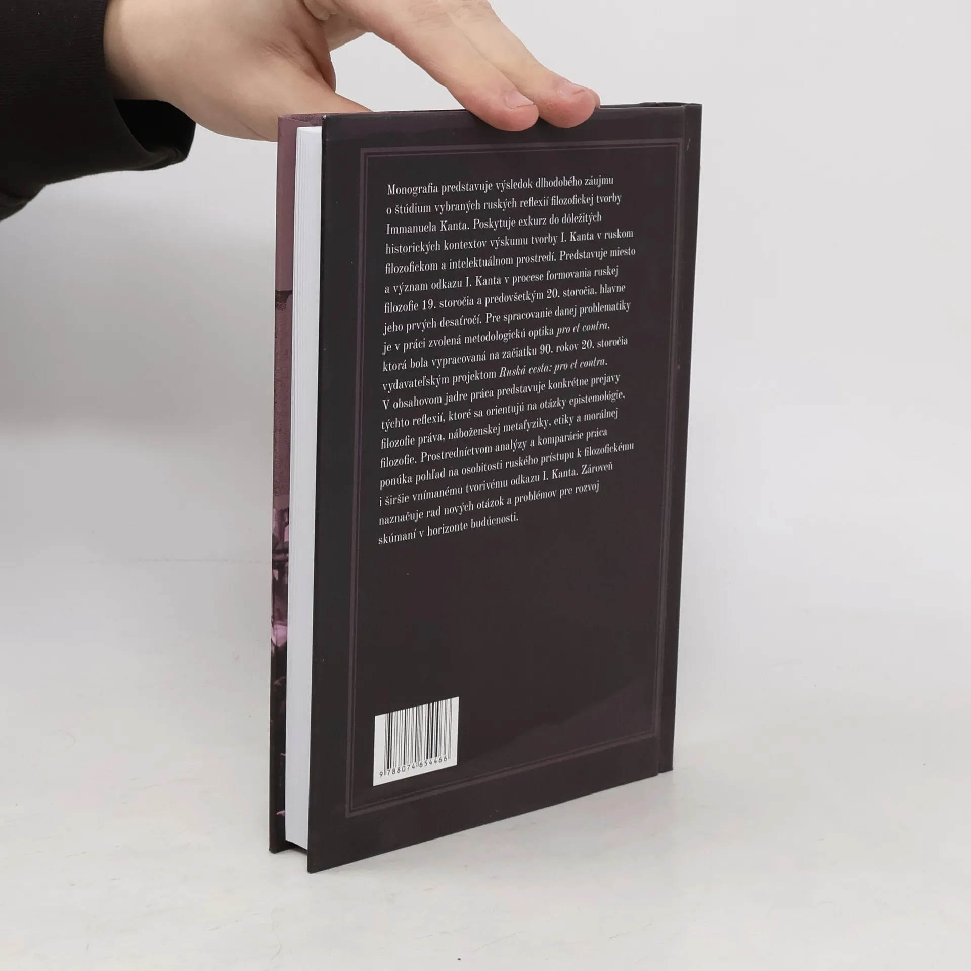 Monografia predstavuje výsledok dlhodobého záujmu o štúdium vybraných ruských reflexií filozofickej tvorby Immanuela Kanta. Poskytuje exkurz do dôležitých historických kontextov výskumu tvorby I. Kanta v ruskom filozofickom a intelektuálnom prostredí. Predstavuje miesto a význam odkazu I. Kanta v procese formovania ruskej filozofie 19. storočia a predovšetkým 20. storočia, hlavne jeho prvých desaťročí. Pre spracovanie danej problematiky je v práci zvolená metodologickú optika pro et contra, ktorá bola vypracovaná na začiatku 90. rokov 20. storočia vydavateľským projektom Ruská cesta: pro et contra. V obsahovom jadre práca predstavuje konkrétne prejavy týchto reflexií, ktoré sa orientujú na otázky epistemológie, filozofie práva, náboženskej metafyziky, etiky a morálnej filozofie. Prostredníctvom analýzy a komparácie práca ponúka pohľad na osobitosti ruského prístupu k filozofickému i širšie vnímanému tvorivému odkazu I. Kanta. Zároveň naznačuje rad nových otázok a problémov pre rozvoj skúmaní v horizonte budúcnosti.