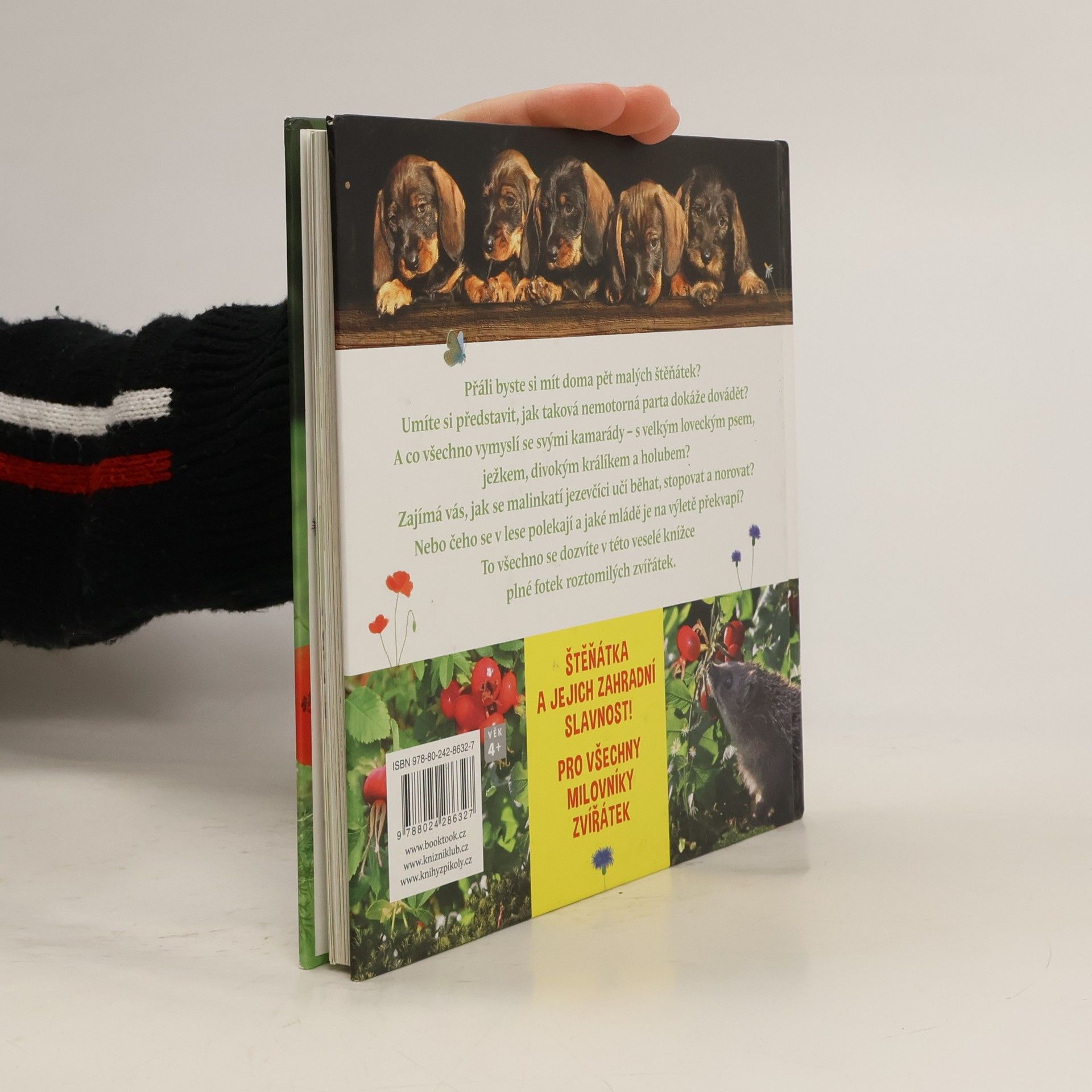 Přáli byste si mít doma pět malých štěňátek? Umíte si představit, jak taková nemotorná parta dokáže dovádět? A co všechno vymyslí se svými kamarády-s velkým loveckým psem, ježkem, divokým králíkem a holubem? Zajímá vás, jak se malinkatí jezevčíci učí běhat, stopovat a norovat? Nebo čeho se v lese polekají a jaké mládě je na výletě překvapí? To všechno se dozvíte v této veselé knížce plné fotek roztomilých zvířátek.