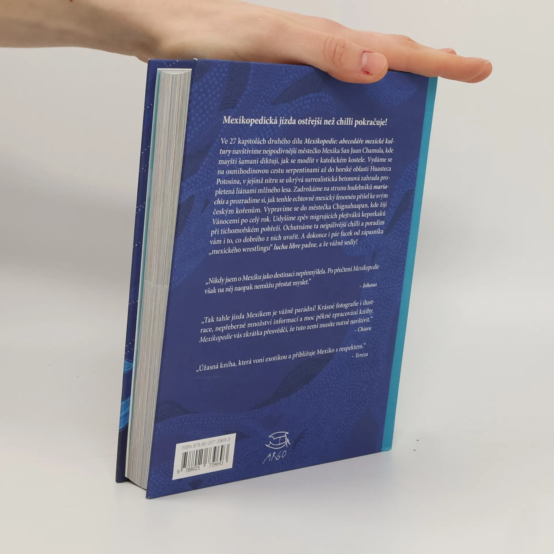Ve 27 kapitolách druhého dílu Mexikopedie: abecedáře mexické kultury navštívíme nejpodivnější městečko Mexika San Juan Chamula, kde mayští šamani diktují, jak se modlit v katolickém kostele. Vydáme se na osmihodinovou cestu serpentinami až do horské oblasti Huasteca Potosina, v jejímž nitru se ukrývá surrealistická betonová zahrada propletená liánami mlžného lesa. Zadrnkáme na strunu hudebníků mariachis a prozradíme si, jak tenhle echtovně mexický fenomén přišel ke svým českým kořenům. Vypravíme se do městečka Chignahuapan, kde žijí Vánocemi po celý rok. Uslyšíme zpěv migrujících plejtváků keporkaků při tichomořském pobřeží. Ochutnáme ta nejpálivější chilli a poradím vám i to, co dobrého z nich uvařit. A dokonce i pár facek od zápasníka „mexického wrestlingu“ lucha libre padne, a že vážně sedly!