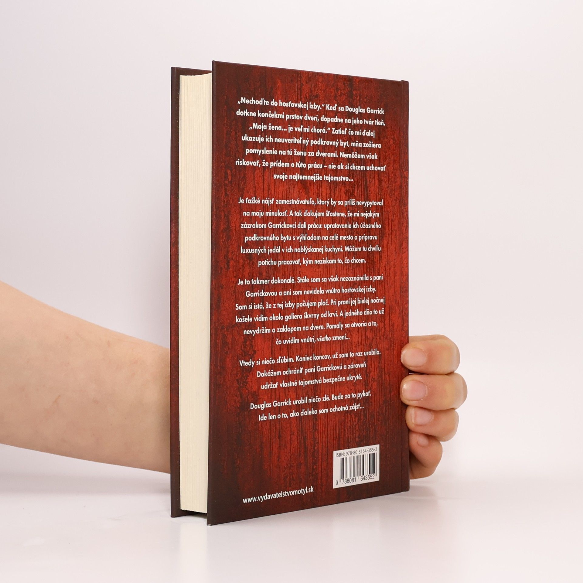 Je ťažké nájsť zamestnávateľa, ktorý by sa príliš nevypytoval na moju minulosť. A tak ďakujem šťastene, že mi nejakým zázrakom Garrickovci dali prácu: upratovanie ich úžasného podkrovného bytu s výhľadom na celé mesto a prípravu luxusných jedál v ich nablýskanej kuchyni. Môžem tu chvíľu potichu pracovať, kým nezískam to, čo chcem. Je to takmer dokonalé. Stále som sa však nezoznámila s pani Garrickovou a ani som nevidela vnútro hosťovskej izby. Som si istá, že z tej izby počujem plač. Pri praní jej bielej nočnej košele vidím okolo goliera škvrny od krvi. A jedného dňa to už nevydržím a zaklopem na dvere. Pomaly sa otvoria a to, čo uvidím vnútri, všetko zmení... Vtedy si niečo sľúbim. Koniec koncov, už som to raz urobila. Dokážem ochrániť pani Garrickovú a zároveň udržať vlastné tajomstvá bezpečne ukryté. Douglas Garrick urobil niečo zlé. Bude za to pykať. Ide len o to, ako ďaleko som ochotná zájsť...