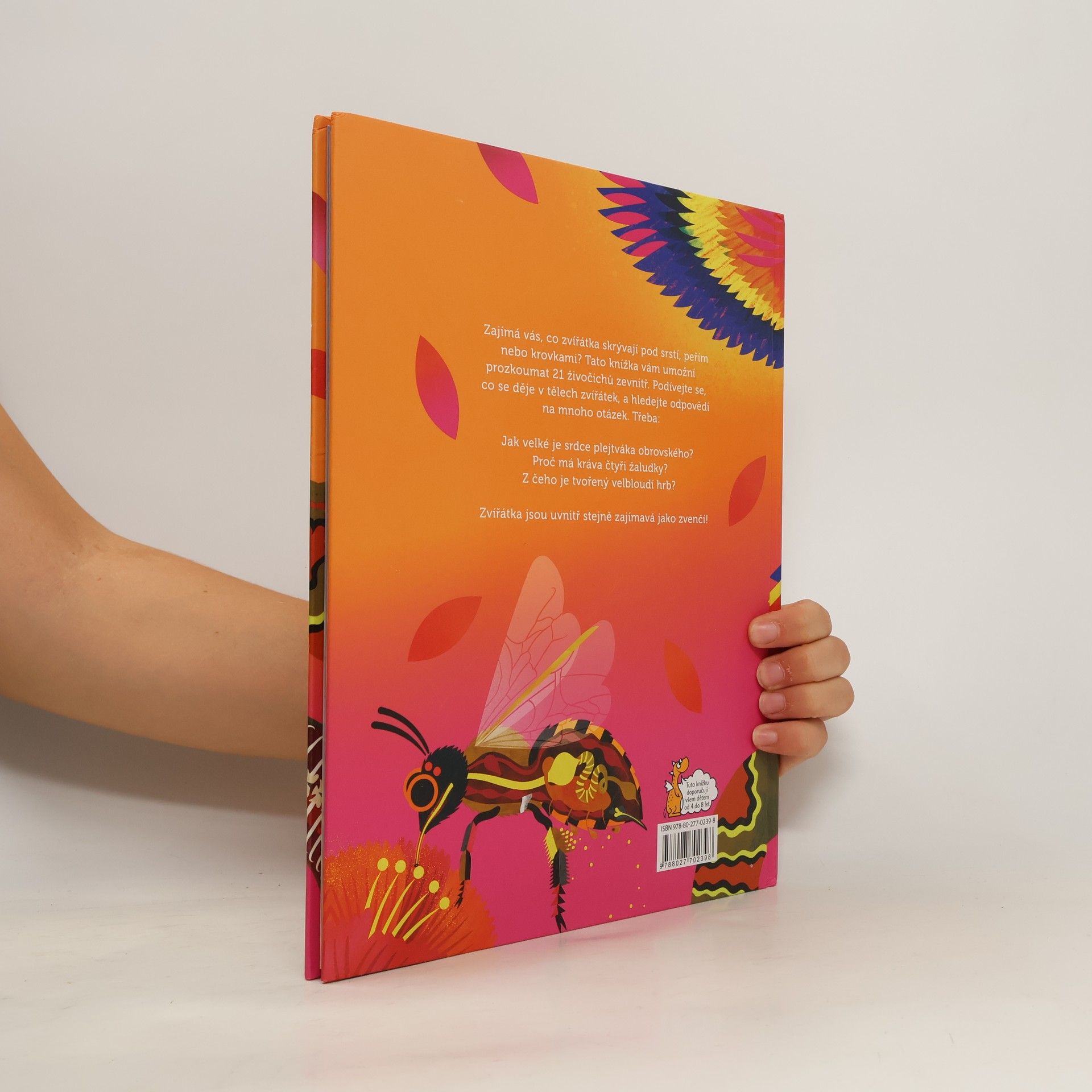 Zajímá vás, co zvířátka skrývají pod srstí, peřím nebo krovkami? Tato knížka vám umožní prozkoumat 21 zvířátek zevnitř. Podívejte se, co se děje v jejich tělech a hledejte odpovědi na mnoho otázek. Třeba: Jak velké je srdce plejtváka obrovského? Proč má kráva čtyři žaludky? Z čeho je tvořený velbloudí hrb? Zvířátka jsou uvnitř možná ještě zajímavější než zvenčí!