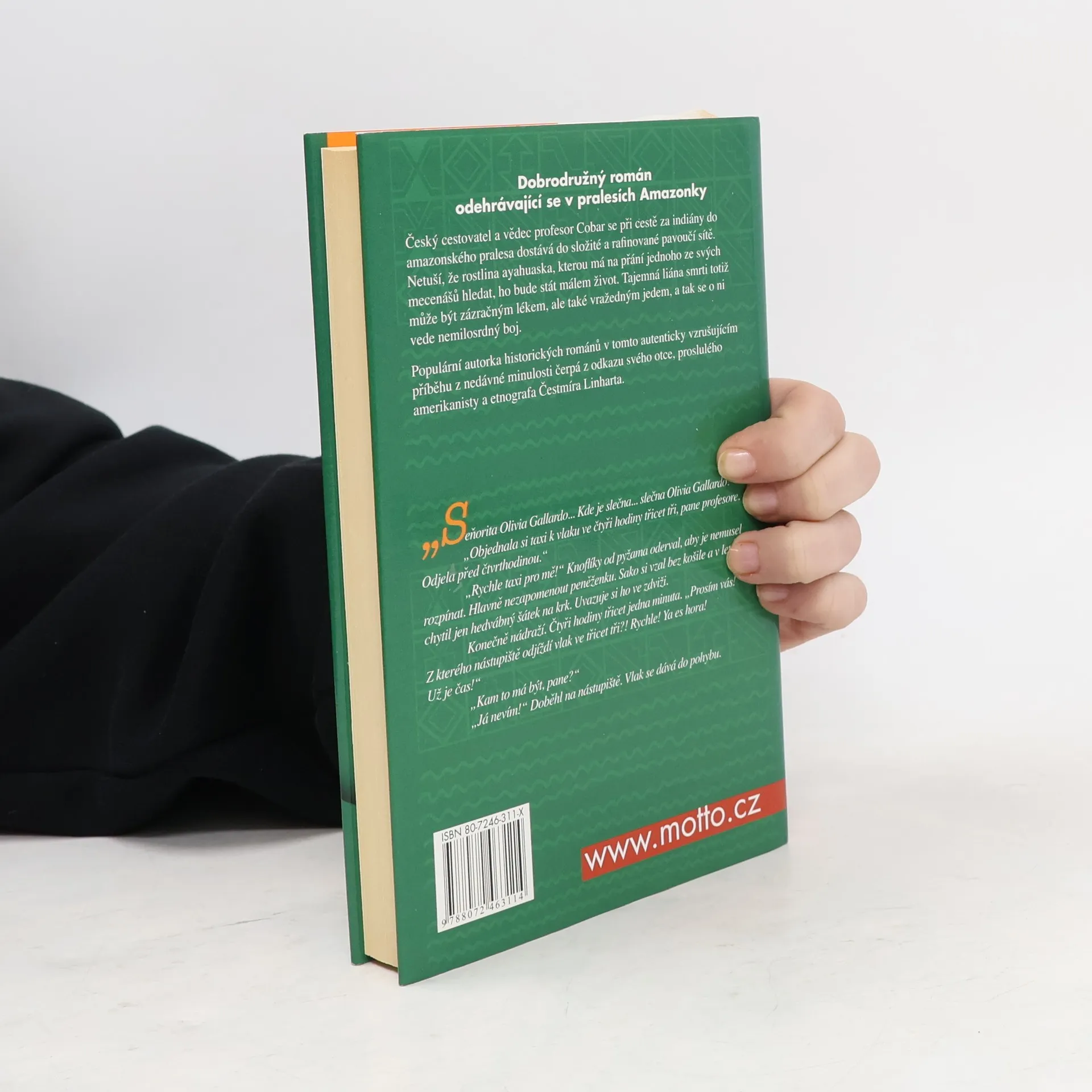 Dobrodružný román odehrávající se v pralesích Amazonky. Český cestovatel a vědec profesor Cobar se při cestě za indiány do amazonského pralesa dostává do složité a rafinované pavoučí sítě. Netuší, že rostlina ayahuaska, kterou má na přání jednoho ze svých mecenášů hledat, ho bude stát málem život. Tajemná liána smrti totiž může být zázračným lékem, ale také vražedným jedem, a tak se o ni vede nemilosrdný boj. Populární autorka historických románů v tomto autenticky vzrušujícím příběhu z nedávné minulosti čerpá z odkazu svého otce, proslulého amerikanisty a etnografa Čestmíra Linharta