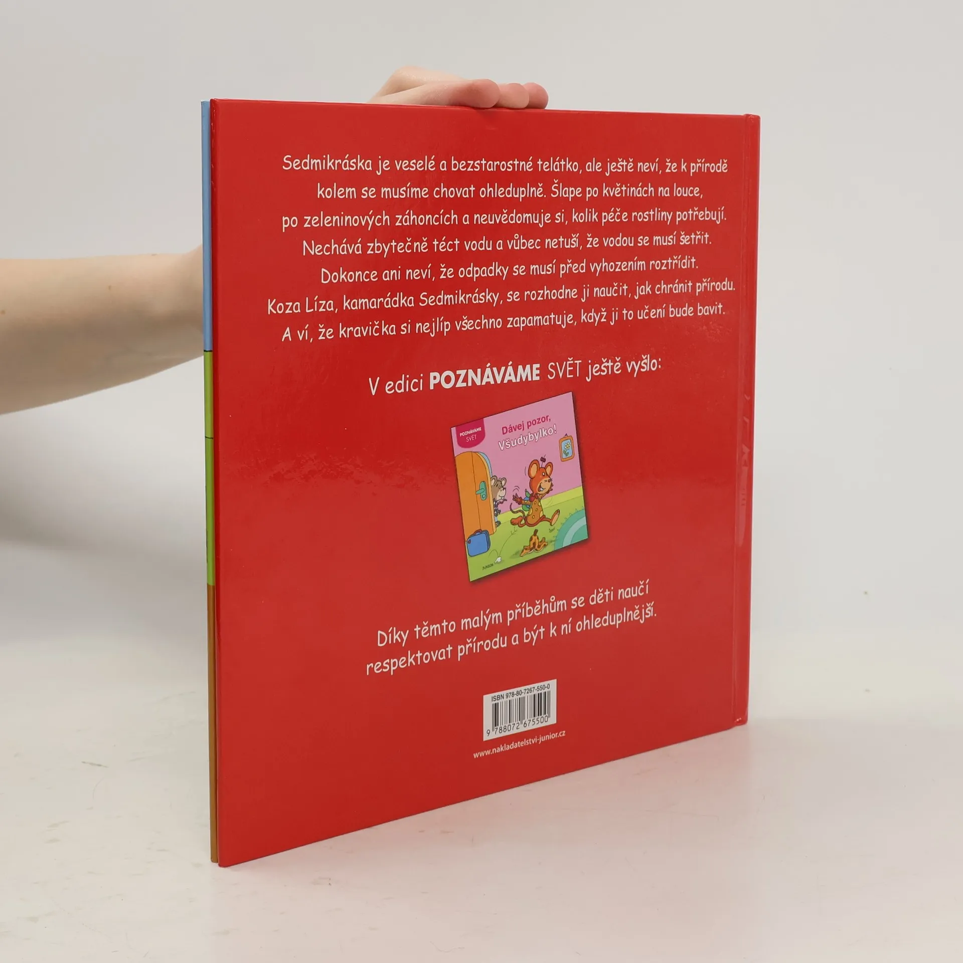 Sedmikráska je veselé a bezstarostné telátko, ale ještě neví, že k přírodě kolem se musíme chovat ohleduplně. Šlape po květinách na louce, po zeleninových záhoncích a neuvědomuje si, kolik péče rostliny potřebují. Nechává puštěnou vodu a vůbec netuší, že vodou se musí šetřit. Dokonce neví, že odpadky se musí před vyhozením roztřídit. Koza Líza, kamarádka Sedmikrásky, se rozhodne ji naučit, jak chránit přírodu. A ví, že kravička si nejlíp všechno zapamatuje, když ji to učení bude bavit. Díky těmto malým příběhům z edice Poznáváme svět se děti naučí respektovat přírodu a být k ní ohleduplnější. Kniha je určena nejmenším čtenářům, které se teprve učí číst.