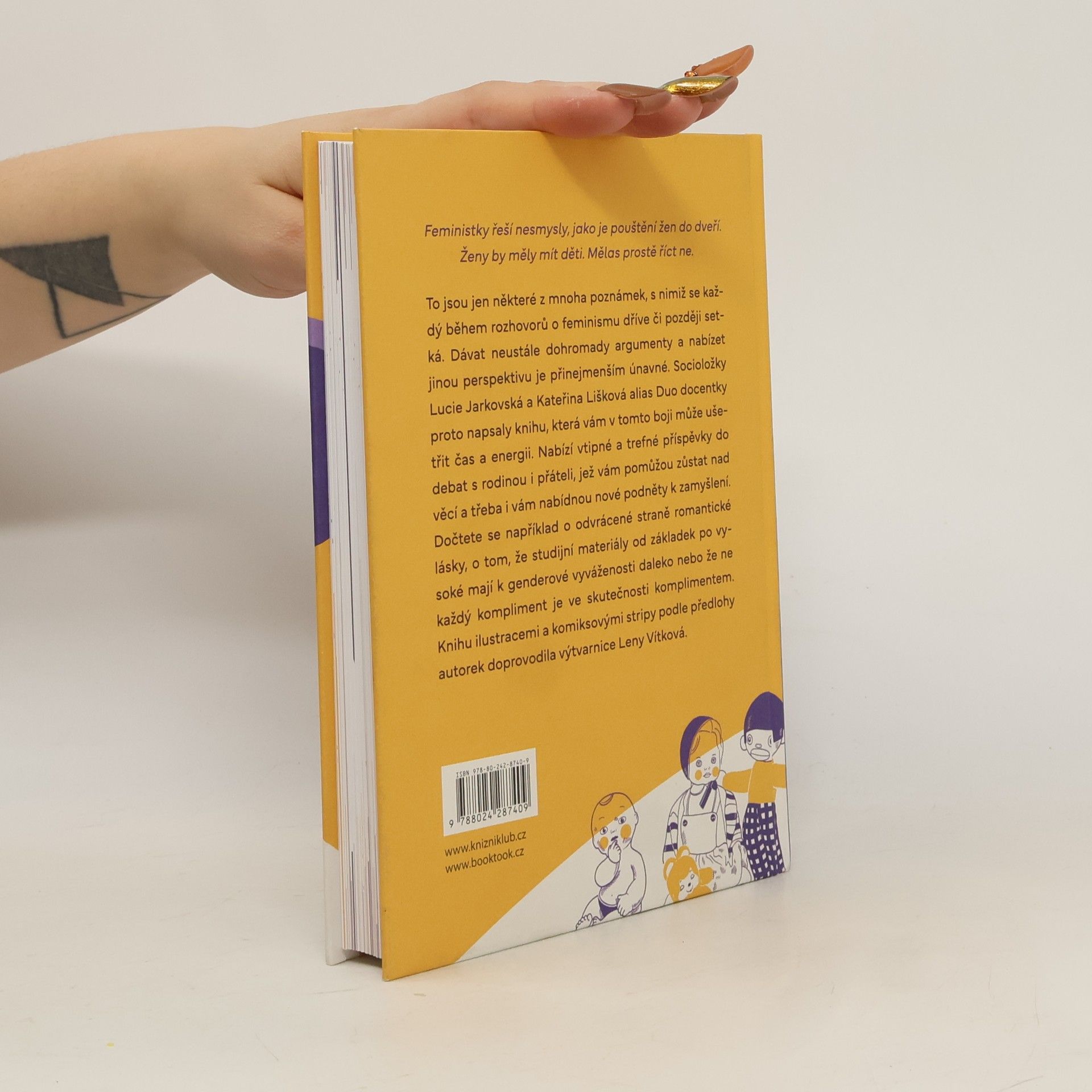 Feministky řeší nesmysly jako je pouštění žen do dveří. Ženy by měly mít děti. Mělas prostě říct ne. To jsou jen některé z mnoha poznámek, s nimiž se každý během rozhovorů o feminismu dříve či později setká. Dávat neustále dohromady argumenty a nabízet jinou perspektivu je přinejmenším únavné. Socioložky Lucie Jarkovská a Kateřina Lišková alias Duo docentky proto napsaly knihu, která vám v tomto boji může ušetřit čas a energii. Nabízí vtipné a trefné příspěvky do debat s rodinou i přáteli, jež vám pomůžou zůstat nad věcí a třeba i vám nabídnou nové podněty k zamyšlení. Dočtete se například o odvrácené straně romantické lásky, o tom, že studijní materiály od základek po vysoké mají k genderové vyváženosti daleko nebo že ne každý kompliment je ve skutečnosti komplimentem. Knihu ilustracemi a komiksovými stripy podle předlohy autorek doprovodila výtvarnice Leny Vítková.
