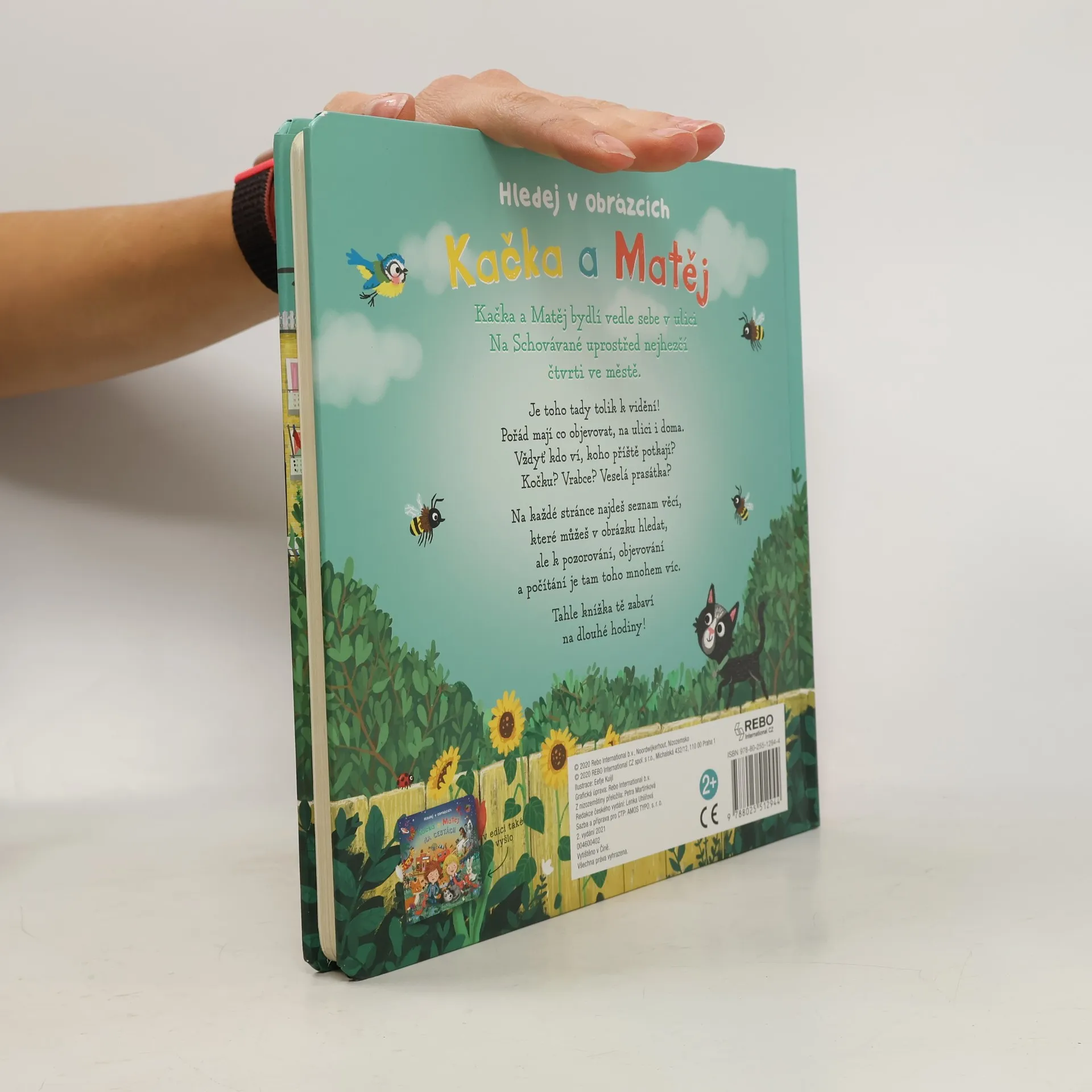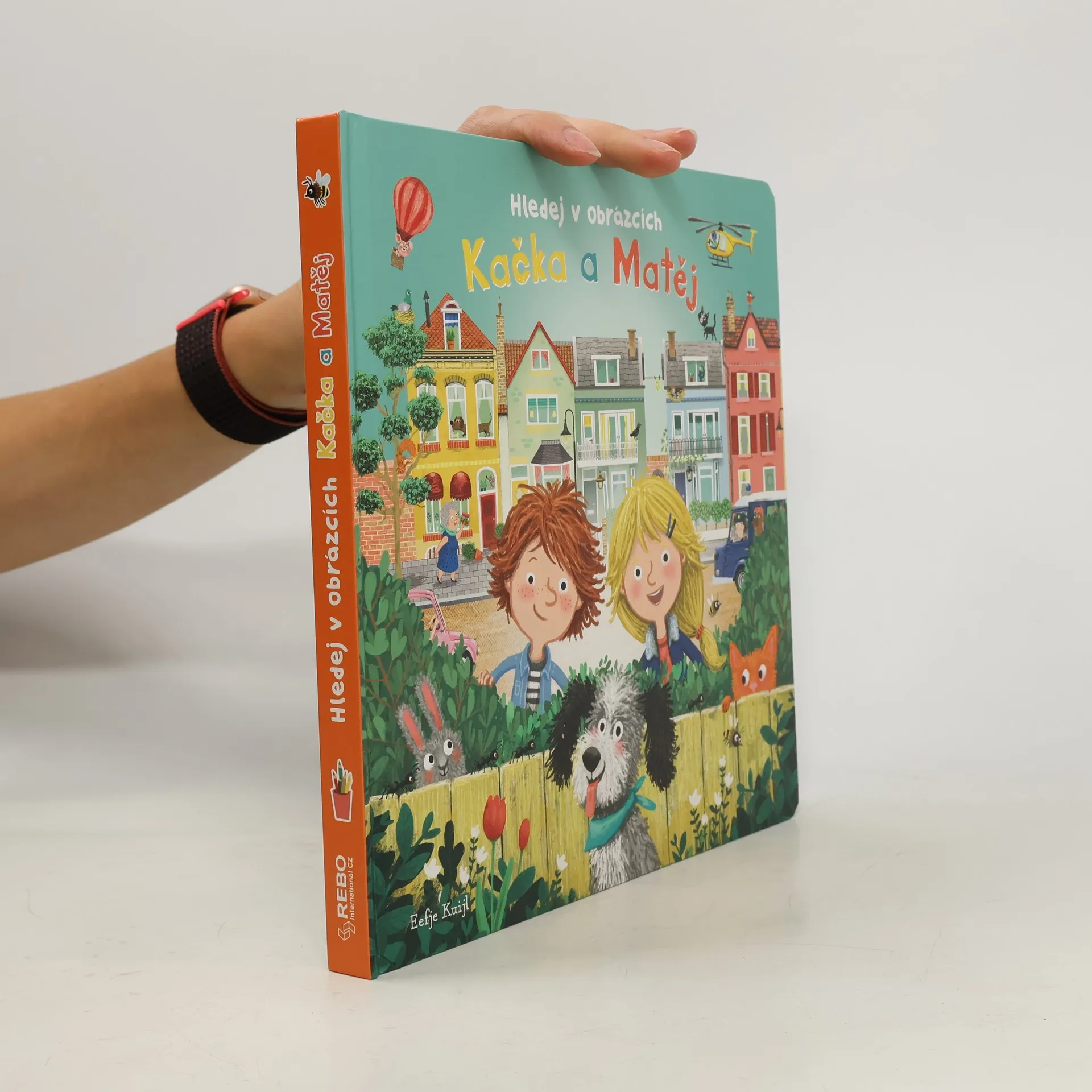 Kačka a Matěj bydlí vedle sebe v ulici Na schovávané v nejhezčí čtvrti ve městě a mají pořád co objevovat, doma i venku. V knížce Kačka a Matěj - hledej v obrázcích, určené zejména nejmenším čtenářům, děti najdou na každé dvojstraně základní seznam věcí, které mohou v obrázku hledat, ale kouzelné detailní ilustrace toho k objevování a počítání nabízejí mnohem víc.