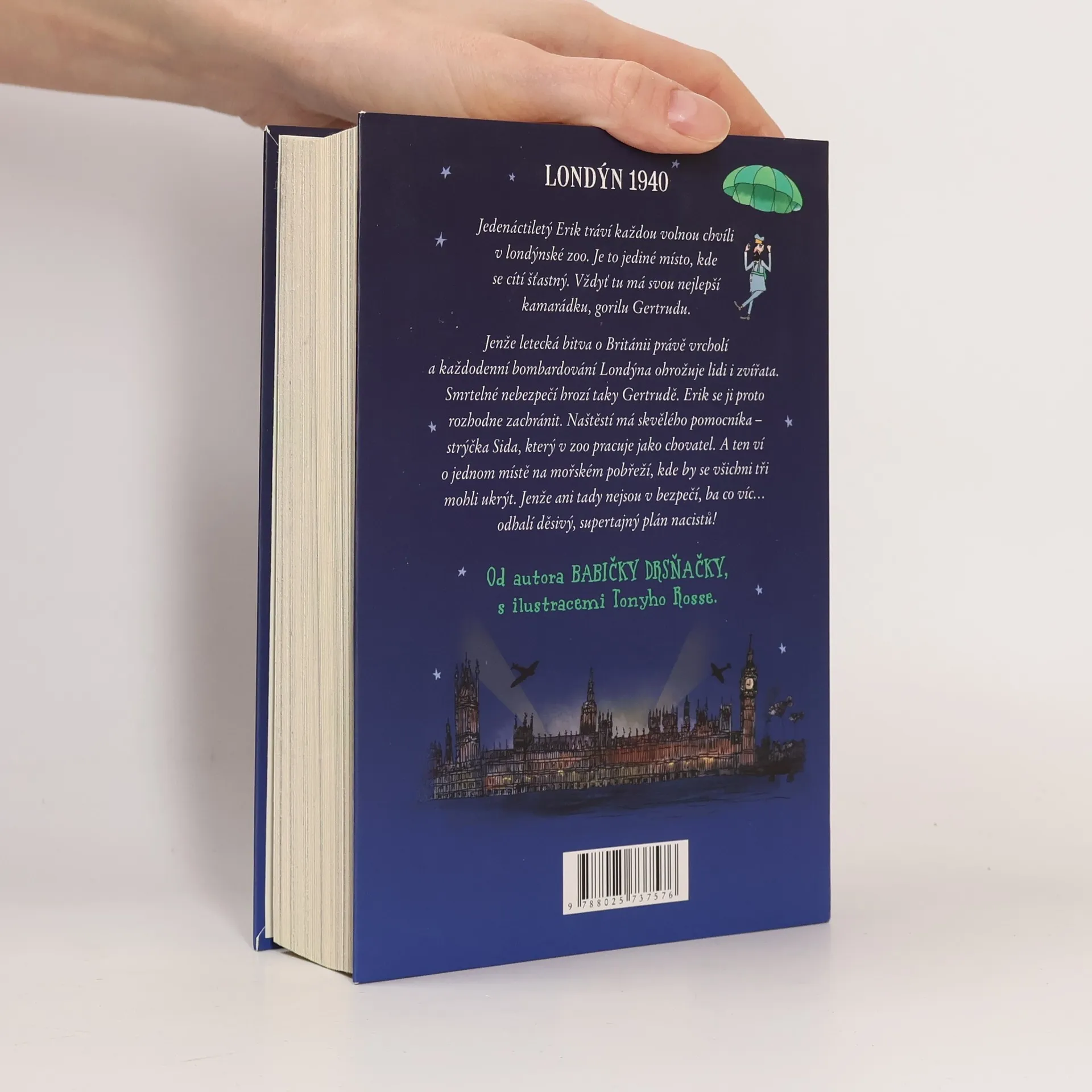 Píše se rok 1940. Bitva o Británii vrcholí. Německá Luftwaffe se snaží zničit britské Královské letectvo a získat vzdušnou převahu nad Lamanšským průlivem. Pokud se to nacistům podaří, dobytí Británie pro ně už bude hračka. Jedenáctiletý Erik tráví každou volnou chvíli v londýnské zoo. Je to jediné místo, kde se cítí šťastný. A jedno ze zvířat mu obzvlášť přirostlo k srdci: gorila Gertruda. Jenže každodenní bombardování města znamená velké ohrožení pro lidi i zvířata. Erik se proto rozhodne milovanou Gertrudu zachránit. Naštěstí má skvělého pomocníka – strýčka Sida, který v zoo pracuje jako chovatel. Podaří se jim ukrýt na mořském pobřeží. Jejich pocit bezpečí ale vezme za své, když odhalí supertajný plán nacistů… David Walliams, autor veleúspěšné Babičky drsňačky, napsal akční, bondovsky laděný příběh z druhé světové války, v němž však není nouze ani o humor. David Walliams je úkaz: děti jeho knihy milují, z každé se stane okamžitě bestseller.