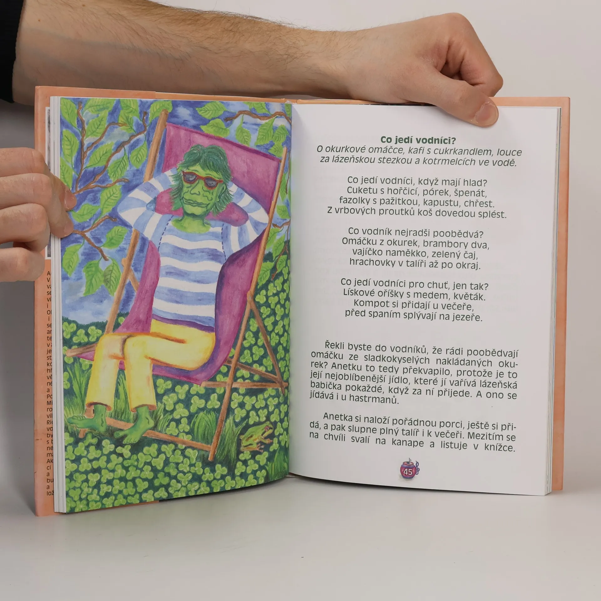Ahoj děti! Chutná vám pampelišková limonáda? Vařívá vám aspoň občas k snídani bílou kávu bílá paní? Dovedete jen tak zprůsvitnět, když vás něco překvapí? Vážně ne? A na Papírové náměstí jste už někdy zavítaly? Tam se dějí věci! Když prší, můžete tam potkat klidně i vodníka na procházce. Nejspíš to bude tím, že v jednom ze stařičkých domů žije jeho kamarádka. Taková neobyčejná holčička Anetka. Je jí osm let pryč a leckdo ví, že je polokouzelná. O té jste už možná slyšely. Tehdy, asi před rokem, když pomuchlé strašidlo rachfle přišustilo nevím už odkud na Papírové náměstí a vyvádělo až hrůza. Nebýt Anetky Podzimkové... Ani to se k vám nedoneslo? K někomu ano. Takhle v rychlosti to odvyprávět stejně nejde. Vy ostatní si raději ten příběh o nastydlých strašidlech přečtěte. Teď vám ale přinášíme zelené povídání o dobráckém vodníkovi Škvejchlovi, se kterým se Anetka Podzimková zná už nějaký ten pátek. Vsadím se o pistáciovou zmrzlinu s petrželí, že zelenějšího kamaráda než je ten Anetky málokdo má. Ale jestli chcete, Škvejchla může kamarádit i s vámi. Je majitelem parádní sbírky hrnečků, lidi netopí a baví ho hrát si s dětmi. Zelené má uši i nos,pod vodou neslyší, jak zpívá kos. Ruce, nohy, uši i krk zelenější má než jehličí smrk.Mokrý má šos na kabátku, rád chodí zalévat předzahrádkunedaleko vltavských vod.Kape mu ze šosů, z kapes i z bot.