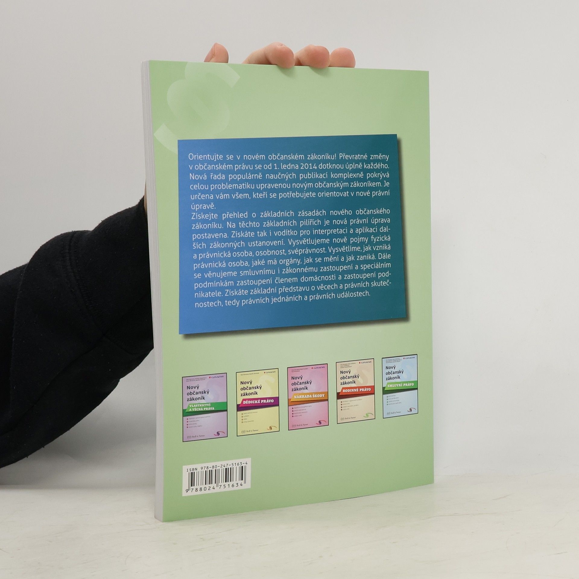 Orientujte se v novém občanském zákoníku! Převratné změny v občanském právu se od 1. ledna 2014 dotknou úplně každého. Nová řada populárně naučných publikací komplexně pokrývající celou problematiku upravenou novým občanským zákoníkem je určena hlavně čtenářům, kteří nejsou právními odborníky, ale potřebují se orientovat v nové právní úpravě. V první části čtenář získá přehled o základních zásadách nového občanského zákoníku. Jde o základní pilíře, na kterých je nová právní úprava postavena a které jsou vodítkem pro interpretaci a aplikaci dalších zákonných ustanovení. Vysvětlujeme nově pojmy fyzická a právnická osoba, osobnost, svéprávnost. Vysvětlíme, jak vzniká právnická osoba, jaké má orgány, jak se mění a jak zaniká. Dále se věnujeme smluvnímu i zákonnému zastoupení a speciálním podmínkám zastoupení členem domácnosti a zastoupení podnikatele. Získáte základní představu o věcech a právních skutečnostech, tedy právních jednáních a právních událostech.