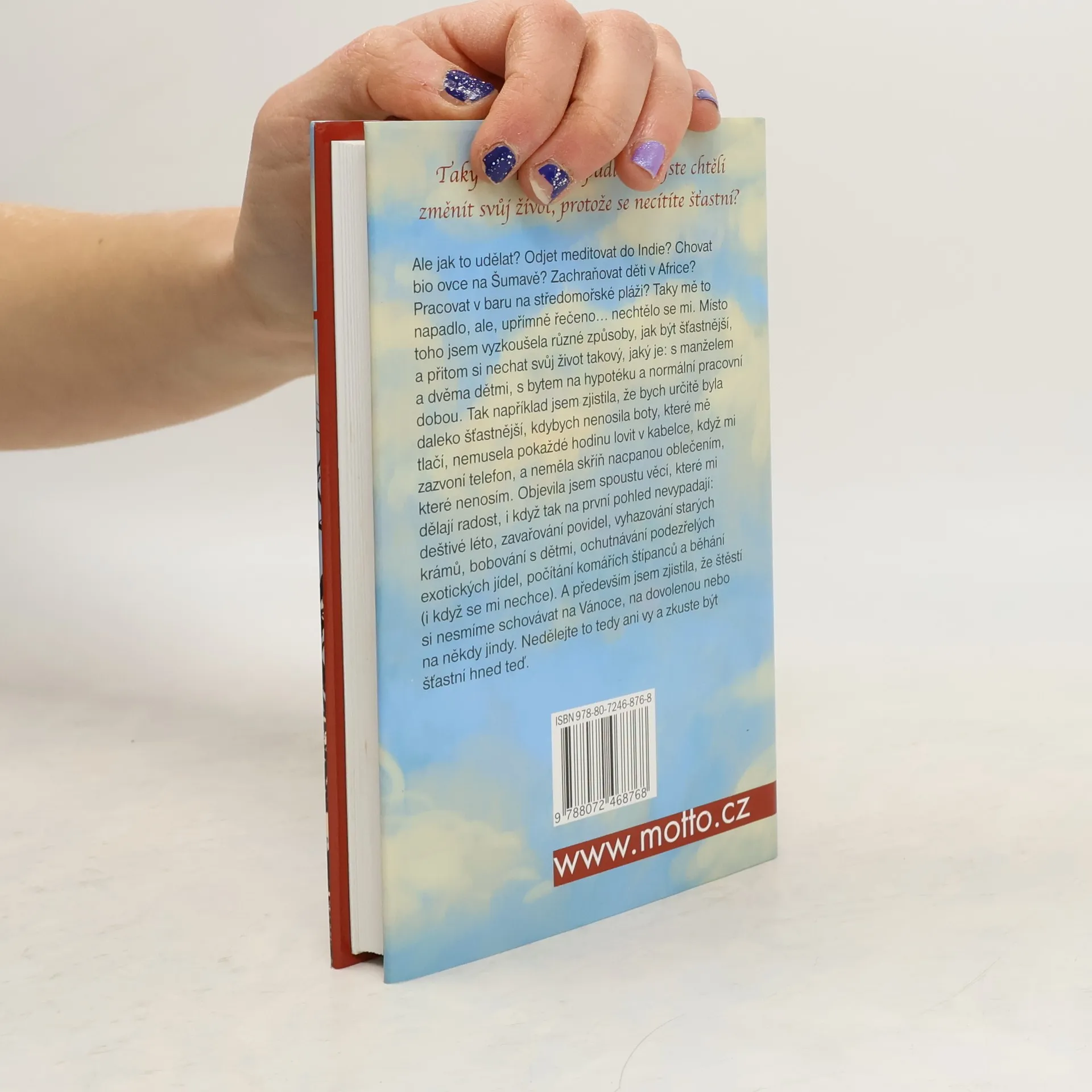 Taky vás někdy napadlo, že byste chtěli změnit svůj život? Odjet meditovat do Indie? Chovat bio ovce na Šumavě? Zachraňovat děti v Africe? Pracovat v baru na středomořské pláži? Taky mě to napadlo, ale, upřímně řečeno... nechtělo se mi. Místo toho jsem vyzkoušela různé způsoby, jak být šťastnější, a přitom si nechat svůj život takový, jaký je: s manželem a dvěma dětmi, s bytem na hypotéku a normální pracovní dobou. A zjistila jsem, že štěstí si nechci schovávat na Vánoce, na dovolenou nebo na někdy jindy.
