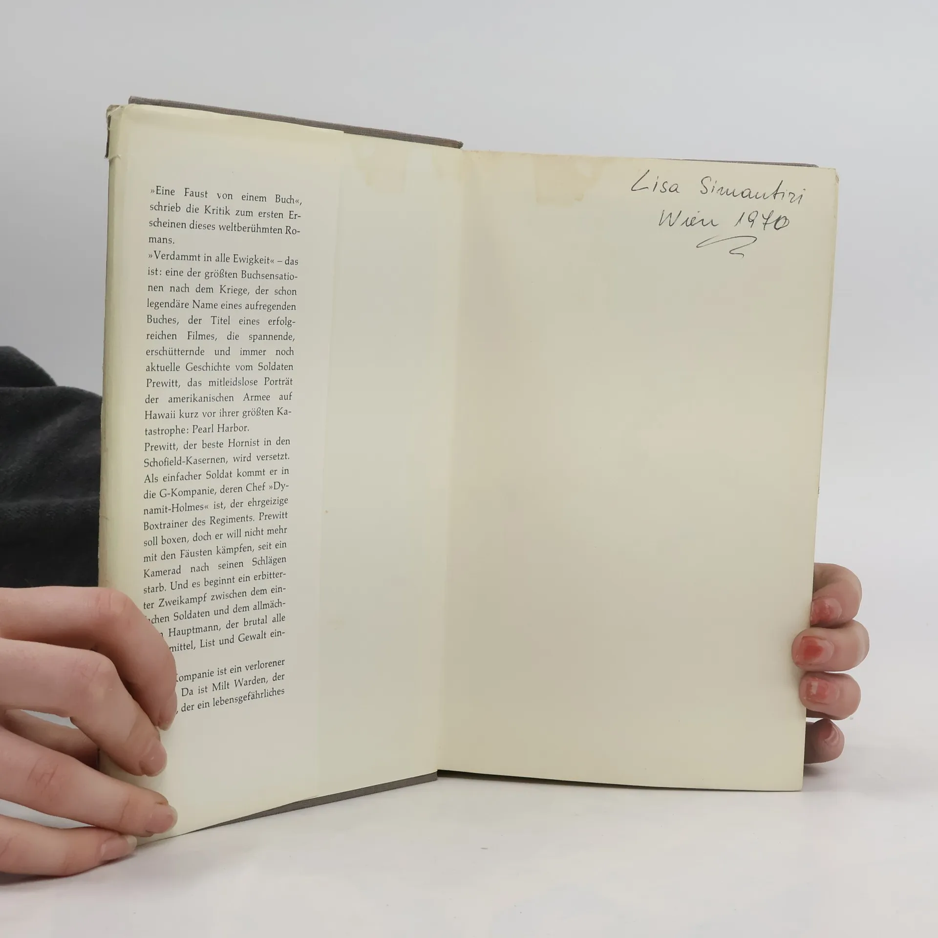 Verdammt in alle Ewigkeit erzählt die Geschichte des Soldaten Prewitt, der kurz vor dem japanischen Angriff auf Pearl Harbour nach Hawaii kommt und brutal geschunden wird, weil er glaubt, auch als Soldat noch gewisse Rechte zu haben, nach einer Messerstecherei verwundet bei einer Freundin untertaucht und schließlich, mehr aus Versehen, erschossen wird. Mit der Veröffentlichung seines Romanerstlings 'From Here to Eternity' entfesselte James Jones 1951 heftige Diskussionen in Amerika. Dort, wie auch in Deutschland, wo der S. Fischer Verlag das Buch noch im selben Jahr herausbrachte, übertraf die schonungslos realistische Schilderung des Soldatenlebens bei weitem das Maß, das der Leser in jenen Jahren vertrug. Aber die erzählerischen Qualitäten von 'Verdammt in alle Ewigkeit' verhalfen dem Buch zu seinem Siegeszug um die Welt, auf dem ihm wenig später der Film folgte. Heute zählt der Roman zu den Klassikern der amerikanischen Nachkriegsliteratur.