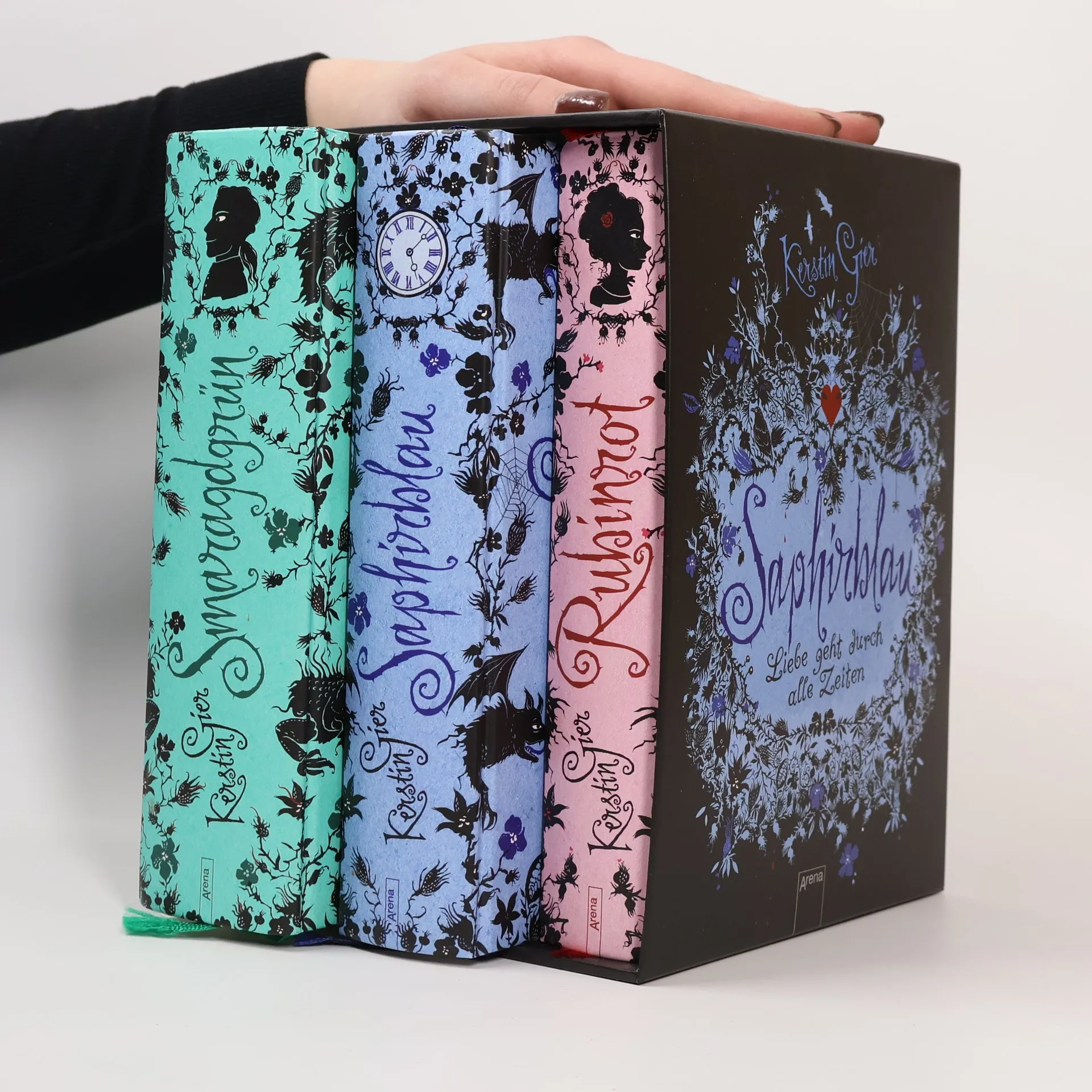 Rubinrot, Saphirblau, Smaragdgrün. Liebe geht durch alle Zeiten. Die Jubiläums-Sonderausgabe im Schuber. Ein MUSS für alle Fans von Bestseller-Autorin Kerstin Gier und ihrer Edelstein-Trilogie : Diese prachtvoll-opulente Schmuckausgabe gehört in jedes Bücherregal! Mit exklusiven Motiven zum Heraustrennen im Schuber - in limitierter Auflage. Der Schuber ist ein Highlight für alte und neue Fans der Zeitreisenden Gwendolyn und Gideon, deren Liebesgeschichte durch alle Zeiten geht. Inhalt: Manchmal ist es ein echtes Kreuz, in einer Familie zu leben, die jede Menge Geheimnisse hat. Der Überzeugung ist zumindest die 16- jährige Gwendolyn. Bis sie sich eines Tages aus heiterem Himmel im London um die letzte Jahrhundertwende wiederfindet. Ihr wird schnell klar, dass sie selbst das größte Geheimnis ihrer Familie ist, und dass man niemandem raten sollte, sich zwischen den Zeiten zu verlieben! Die hochwertig veredelte, streng limitierte Schmuckausgabe umfasst die drei Einzelbände „Rubinrot“, „Saphirblau“ und „Smaragdgrün“ - mehr als 1.200 Seiten Zeitreise-Romantik pur! Großartig illustriert von Eva Schöffmann-Davidov.