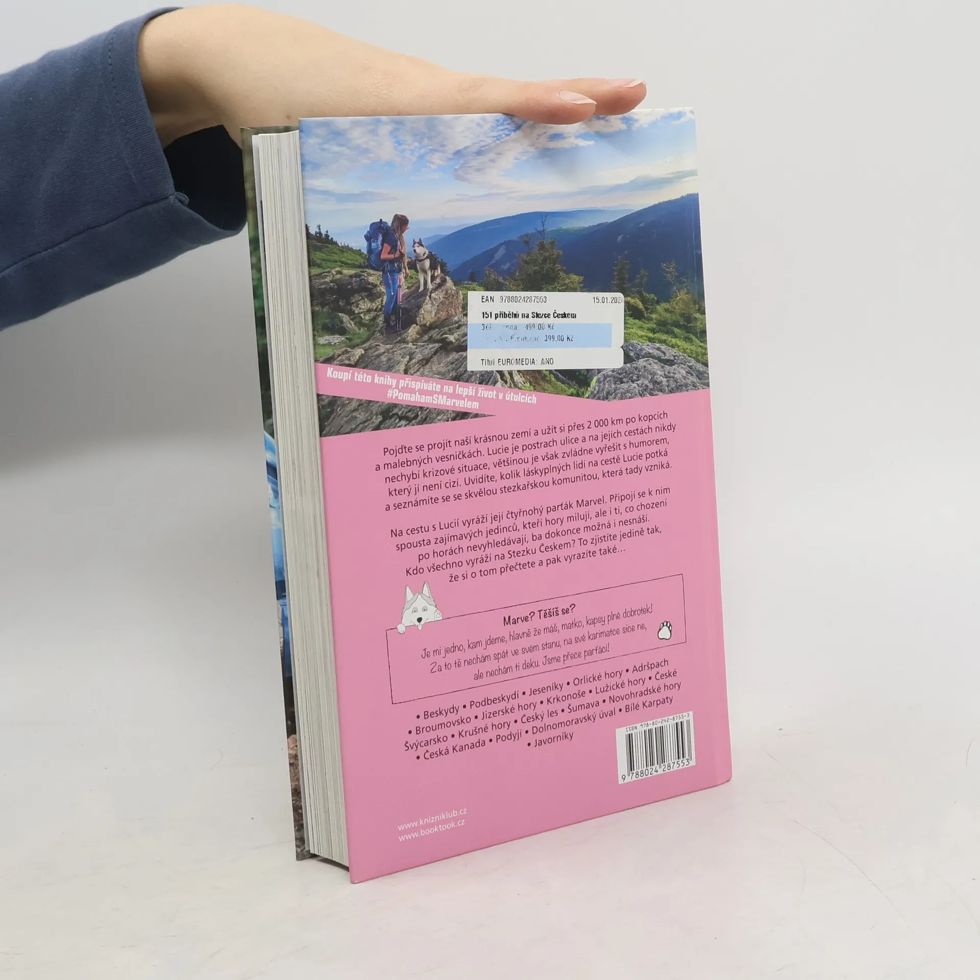 Lucie ve svých předešlých knihách popisovala krásy evropských stezek a náročnou Pacifickou hřebenovku. Tentokrát se však zaměřila na něco, co máme mnohem blíže. Na Stezku Českem.Pojďte si projít celou naši krásnou republiku a užít si přes 2000 km po českých kopcích a malebných vesničkách. Lucie je postrach ulice a na jejích cestách nikdy nechybí krizové situace, jež však většinou zvládne vyřešit s humorem, který jí není cizí. Uvidíte, kolik láskyplných lidí na cestě Lucie potká a s kým vším se seznámí.Na cestu s Lucií vyráží její největší parťák – sibiřský husky Marvel. Ale nebude jediný, kdo se k ní připojí. Nechá se zase ukecat brácha, který nesnáší šlapání do kopců? Přijedou kamarádky s dětmi? Připojí se 12letá holčička, která všem vytře zrak? Bude se partnerovi Lůcy stýskat více po Marvelovi, nebo po ní? Přijede i Marvelův tatínek? Kamarád, co miluje lezení a nesnáší chození? Kámoška s dalším huskym? Náhodní kolemjdoucí z přednášky? Guru lásky?Marvel: Je jedno, kam jdeme, hlavně že má matka kapsy plné kokin. Za to ji většinou nechám spát v mém stanu a na mé karimatce. V mém spacáku. A Honzovi se vždycky stýská více po mně.