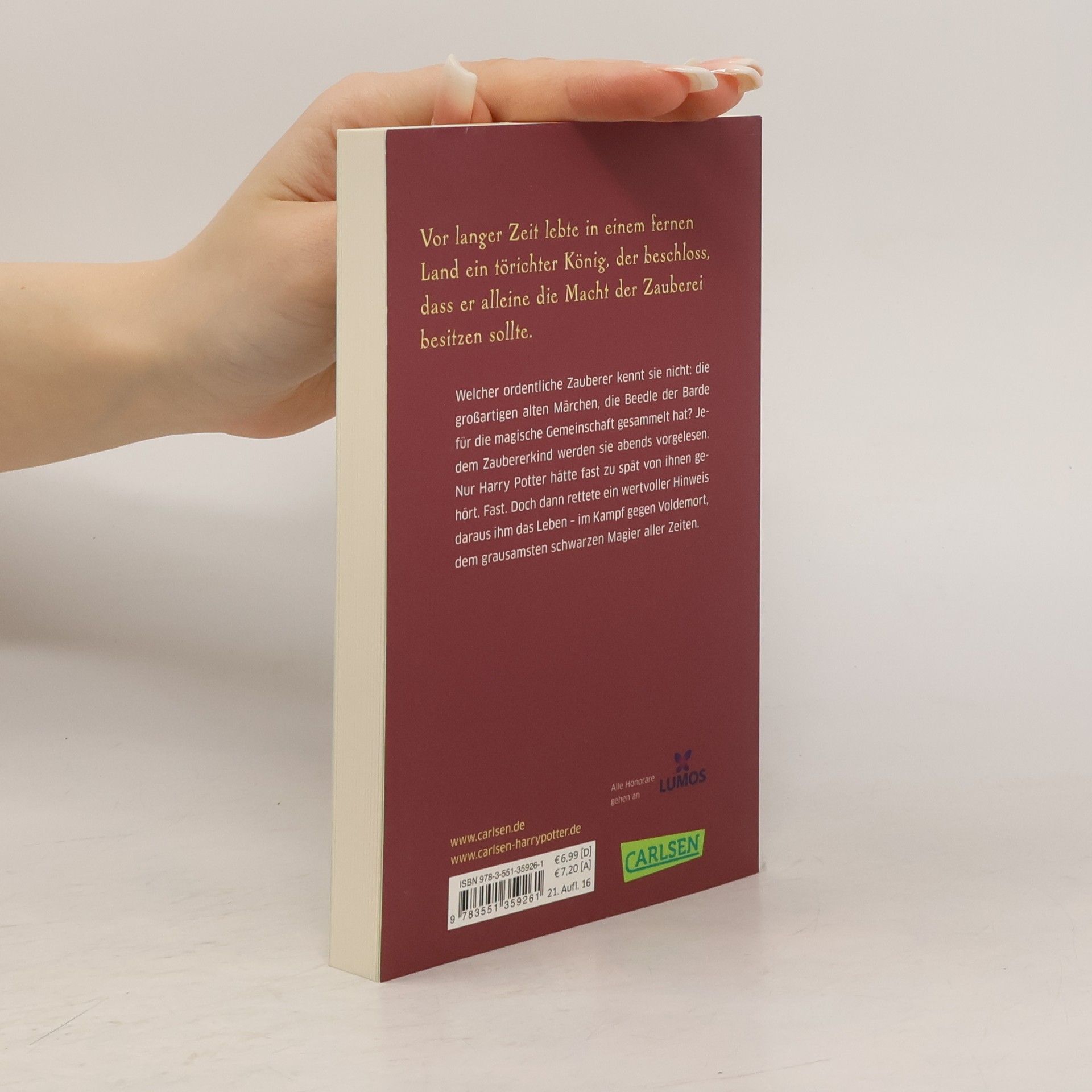 Welcher ordentliche Zauberer kennt sie nicht: die großartigen alten Märchen, die Beedle der Barde für die magische Gemeinschaft gesammelt hat? Jedem Zaubererkind werden sie abends vorgelesen. Nur Harry Potter hätte fast zu spät von ihnen gehört. Fast. Doch dann rettete ein wertvoller Hinweis daraus ihm das Leben - im Kampf gegen Voldemort, dem grausamsten schwarzen Magier aller Zeiten. Nun endlich haben auch Muggels die Gelegenheit, fünf der Märchen kennenzulernen. Eine Sternstunde für Potter-Fans. Und für alle, die zauberhafte Geschichten lieben. Mit einem Cover der Harry-Potter-Illustratorin Sabine Wilharm.