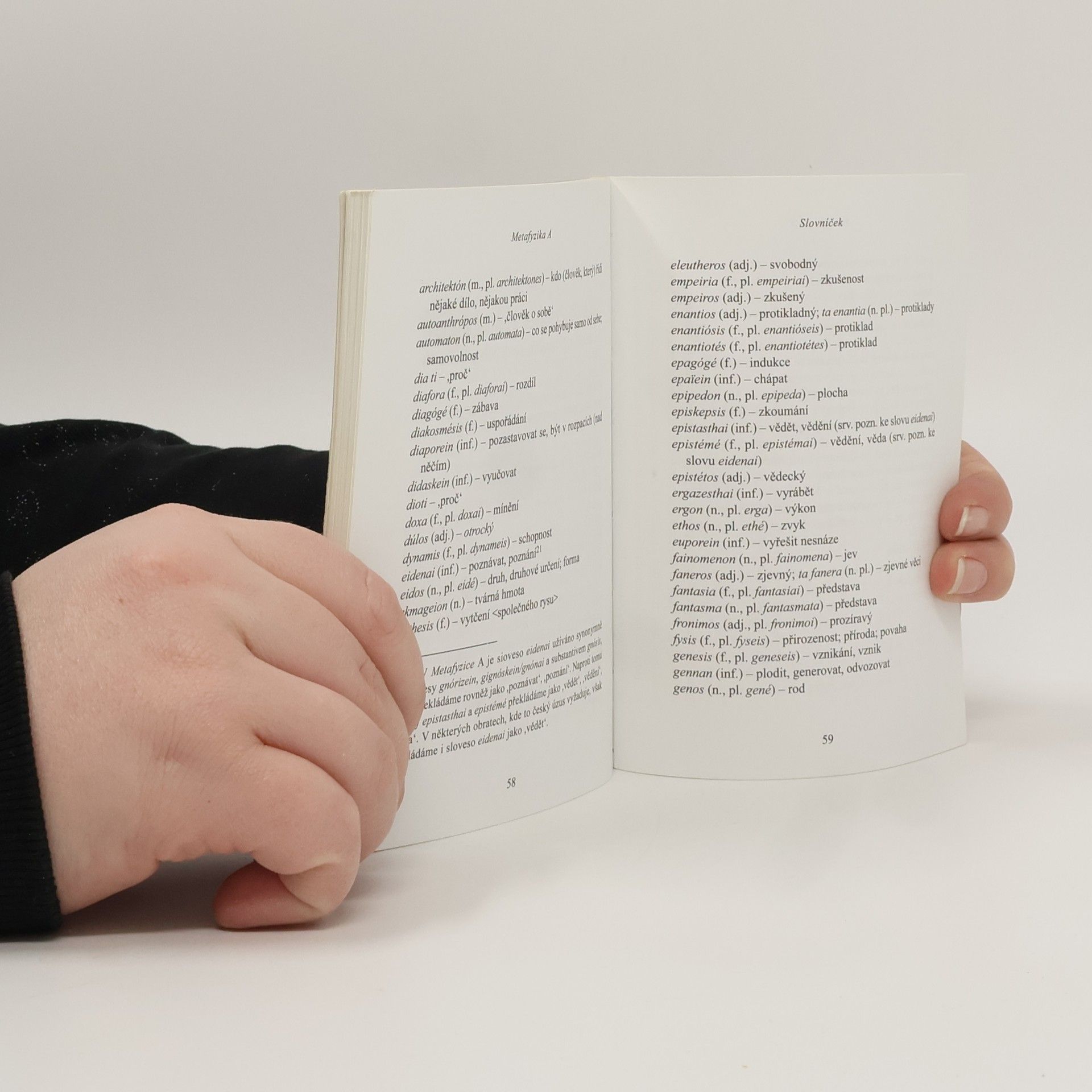 Metafyzika A je úvodní knihou souboru Aristotelových spisů věnovaných otázkám první filosofie. Aristotelés zde definuje filosofii jako vědu o prvních počátcích a příčinách. Na pozadí své vlastní nauky o příčinách podává přehled názorů svých předchůdců od Thaléta přes pythagorejce až po Platóna a podrobuje je kritice. Nový český překlad F. Karfíka.