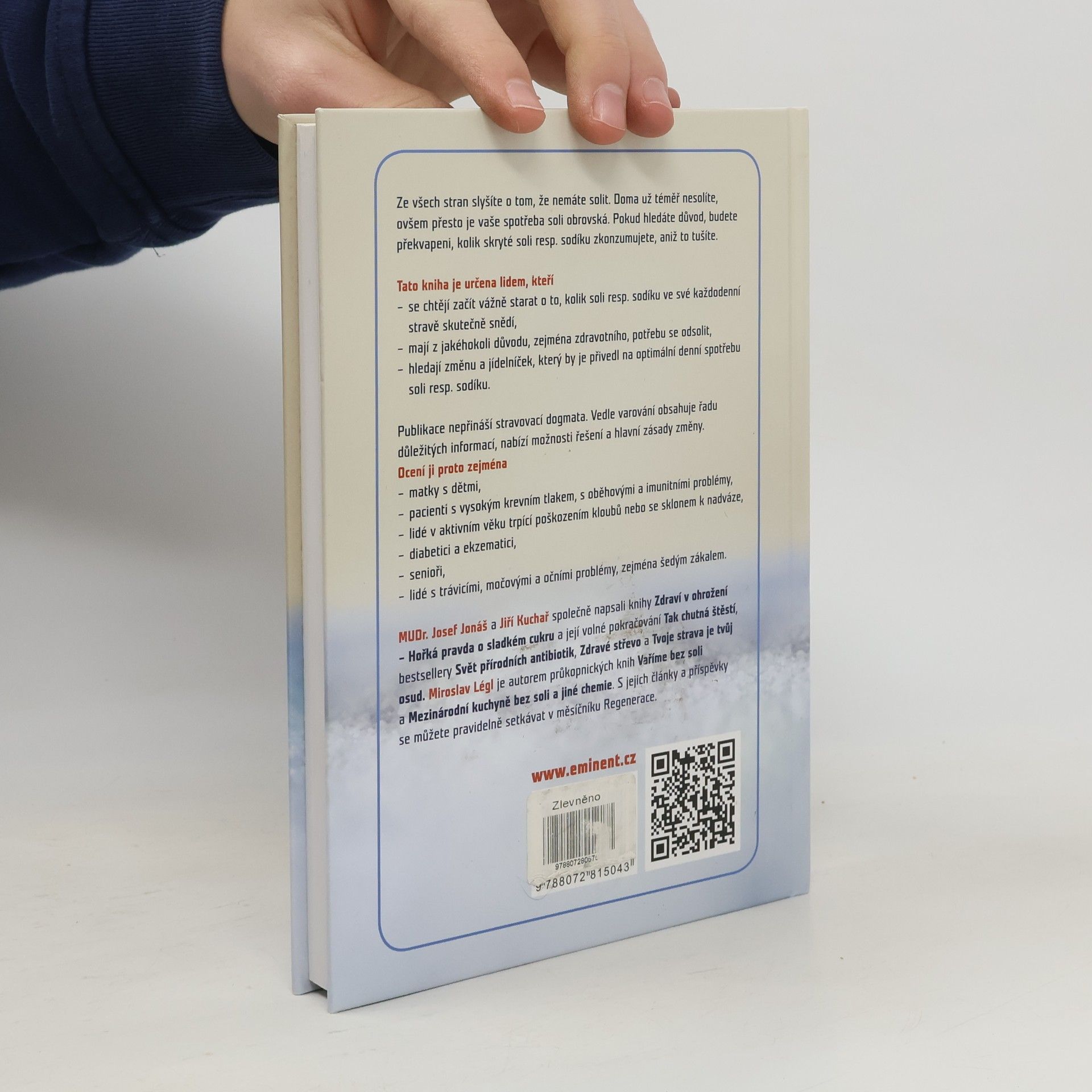 Ze všech stran slyšíte o tom, že nemáte solit. Doma už téměř nesolíte, ovšem přesto je vaše spotřeba soli obrovská. Pokud hledáte důvod, budete překvapeni, kolik skryté soli zkonzumujete, aniž to tušíte. Tato kniha je určena lidem, kteří - se chtějí začít vážně starat o to, kolik soli resp. sodíku ve své každodenní stravě snědí - mají z jakéhokoli důvodu, zejména zdravotního, potřebu se odsolit - hledají změnu a jídelníček, který by je přivedl na optimální denní spotřebu soli Publikace nepřináší žádná stravovací dogmata. Vedle varování obsahuje mnoho důležitých informací, možností řešení a hlavních zásad změny. Ocení ji proto zejména - matky s dětmi - pacienti s vysokým krevním tlakem, s oběhovými a imunitními problémy - lidé v aktivním věku trpící poškozením kloubů nebo se sklonem k nadváze - diabetici a ekzematici - senioři - lidé s trávicími, močovými a očními problémy, zejména šedým zákalem