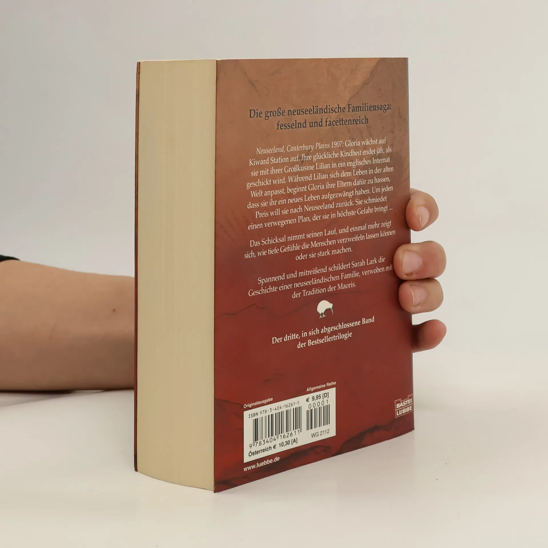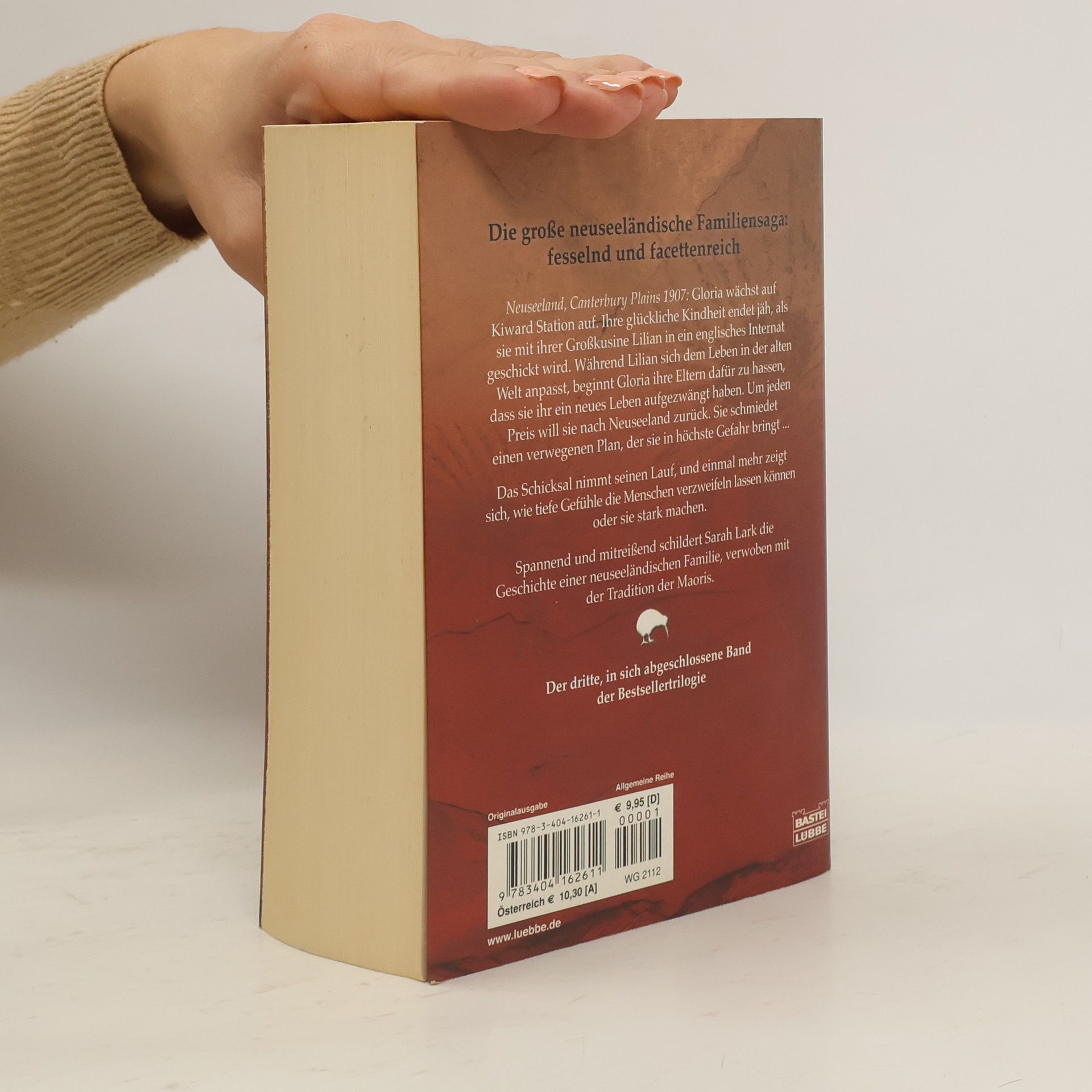 Neuseeland, Canterbury Plains 1907: Für Gloria bricht eine Welt zusammen, als sie Kiward Station verlassen muss. Mit ihrer Großcousine Lilian tritt sie die Reise nach England an, wo die beiden jungen Mädchen ein Internat besuchen sollen. Während Lilian sich rasch einlebt, fühlt sich Gloria fremd und ausgeschlossen. Um jeden Preis will sie nach Neuseeland zurück und schmiedet einen verwegenen Plan, der sie in höchste Gefahr bringt. So nimmt das Schicksal seinen Lauf, und einmal mehr zeigt sich, wie tiefe Gefühle die Menschen verzweifeln lassen - oder stark machen. Spannend und mitreißend schildert Sarah Lark die Geschichte einer neuseeländischen Familie, verwoben mit der Tradition der Maoris. Der dritte, in sich abgeschlossene Band der Bestsellertrilogie