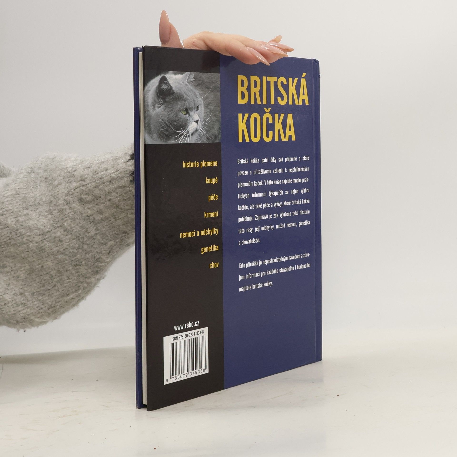 Příručka je nepostradatelným návodem a zdrojem informací pro každého stávajícího i budoucího majitele britské kočky. Získáte rady ohledně koupě kotěte (u kterého chovatele? kocoura či kočku?), jeho uvedení do nového domova, výchovy a výuky hygienickým návykům, výběru vhodného příslušenství (pelíšek, hračky, toaleta, vodítko...). Dozvíte se vše o rutinní i speciální péči: plnohodnotná strava a krmení, péče o vzhled (koupání, česání, stříhání drápků), zdravotní péče (příznaky onemocnění, typické problémy). Obsáhlé kapitoly se zaměřují na výklad barvové genetiky a přesný popis různých barevných verzí, v nichž se britská kočka chová (jednobarevné a želvovinové kočky, tabby a stříbřité tabby, particolours a colourpoints, kouřové a závojové kočky) - včetně seznamu barev. Nechybí přesný popis plemenného standardu, slovníček souvisejících odborných pojmů a seznam důležitých kontaktních adres na chovatelské organizace a kluby. Kniha je bohatě ilustrována množstvím poutavých barevných fotografií.