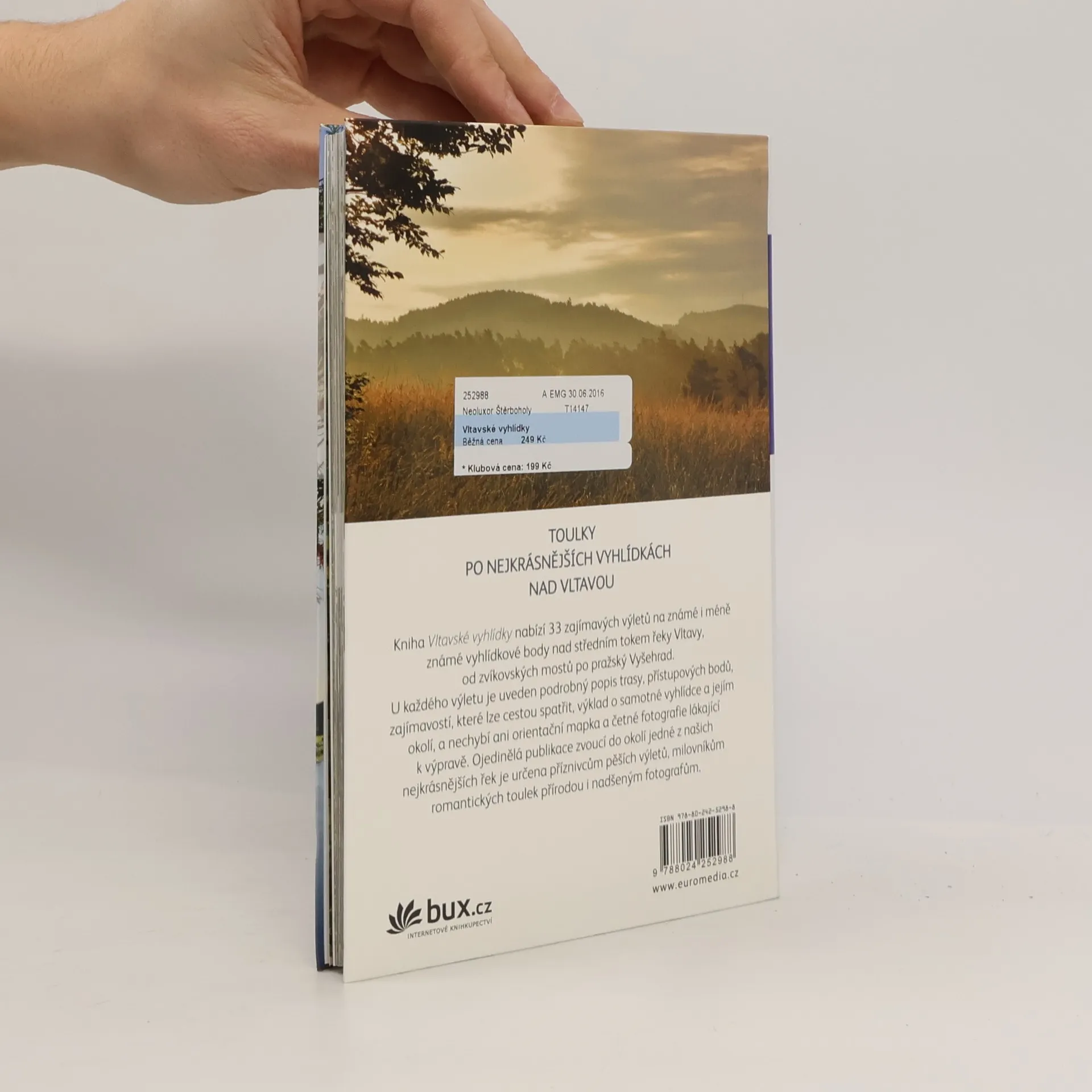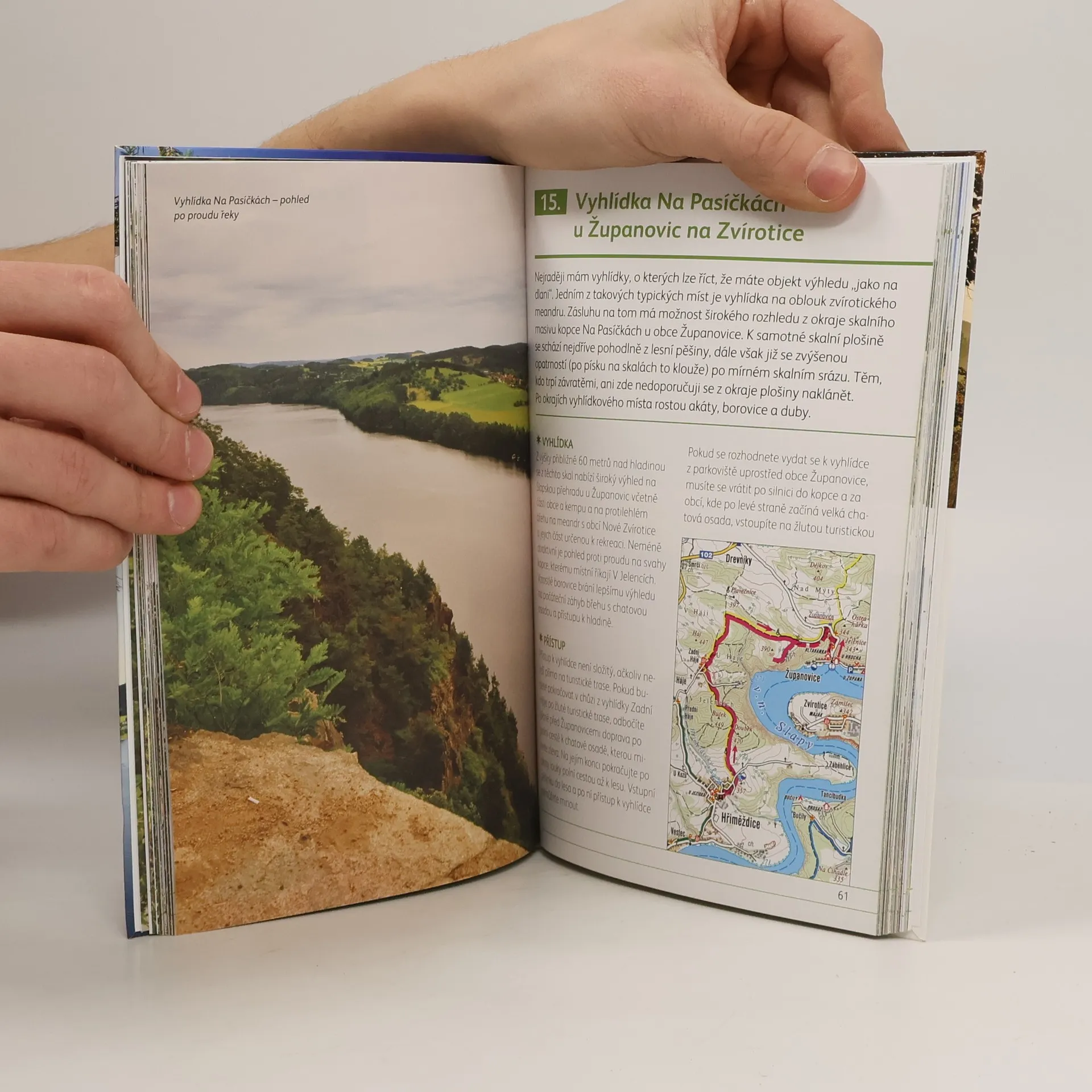 Výlety na 33 známých i méně známých vyhlídek nad meandry středního toku Vltavy. Povídání o jednotlivých vyhlídkách včetně fotografií, souřadnic, popisu přístupu (autem, autobusem, na kole či pěšky) a výřezu z turistických map začíná těsně před soutokem Vltavy s Otavou. Vyhlídky jsou za sebou řazeny v pořadí po proudu řeky Vltavy a pojmenovány tak, jak uvádějí turistické mapy, nebo jak je nazývají místní obyvatelé. Některé jsou známy méně, jedna z nejhezčích dokonce není ani v turistických mapách. Většina je přístupná po turistických značkách, některé jsou součástí naučných stezek, k některým se dostanete jen pomocí popisu trasy nebo díky uvedeným souřadnicím. Všechny mají svoje kouzlo a přitahují příznivce toulek v rodinném kruhu, vyznavače individuální turistiky, nebo jsou cílem zamilovaných či prostě romantiků.