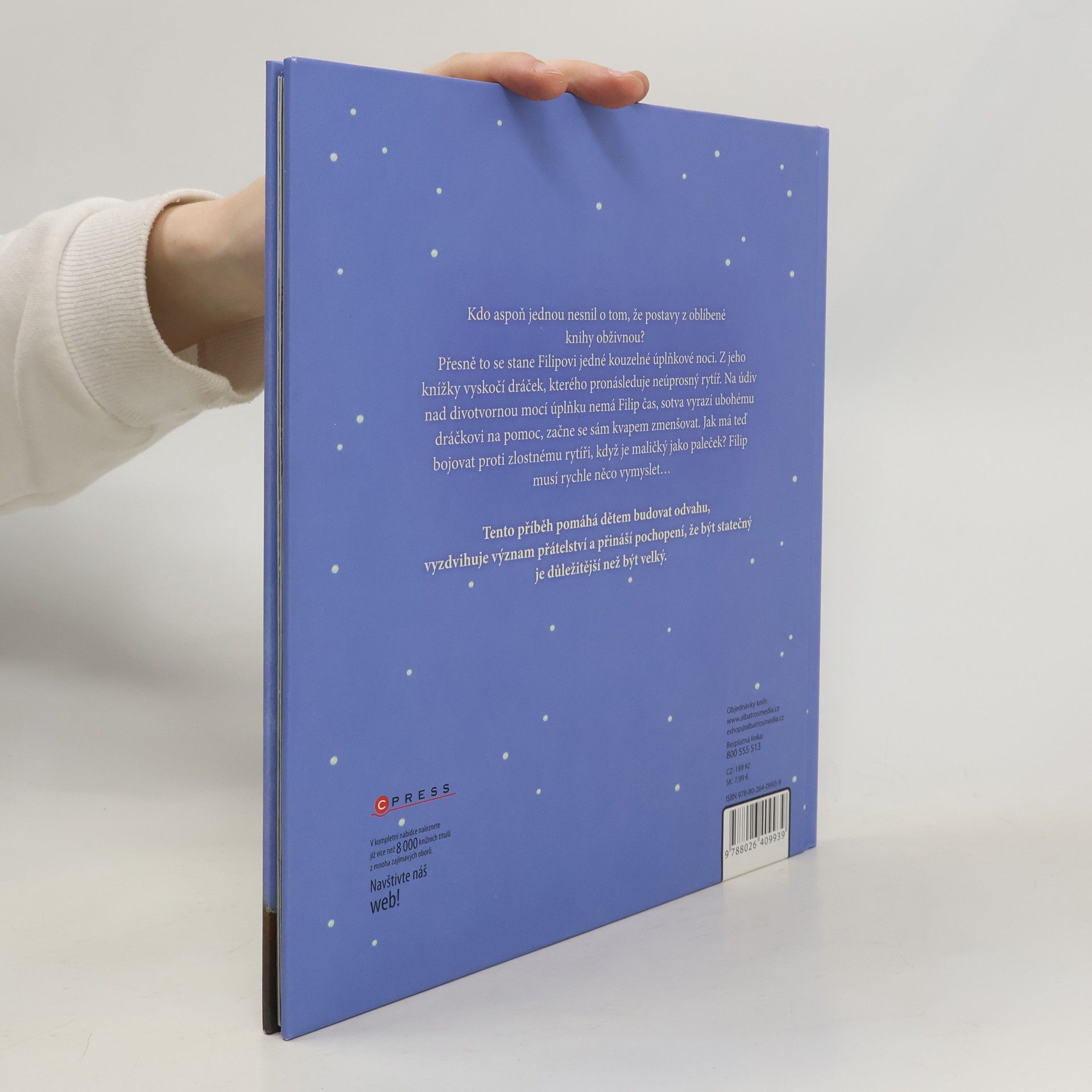 Kdo aspoň jednou nesnil o tom, že postavy z oblíbené knihy obživnou? Přesně to se stane Filipovi jedné kouzelné úplňkové noci. Z jeho knížky vyskočí dráček, kterého pronásleduje neúprosný rytíř. Na údiv nad divotvornou mocí úplňku nemá Filip čas, sotva vyrazí ubohému dráčkovi na pomoc, začne se sám kvapem zmenšovat. Jak má teď bojovat proti zlostnému rytíři, když je maličký jako paleček? Filip musí rychle něco vymyslet… Tento půvabný příběh pomáhá dětem budovat odvahu, vyzdvihuje význam přátelství a přináší pochopení, že být statečný je důležitější než být velký.
