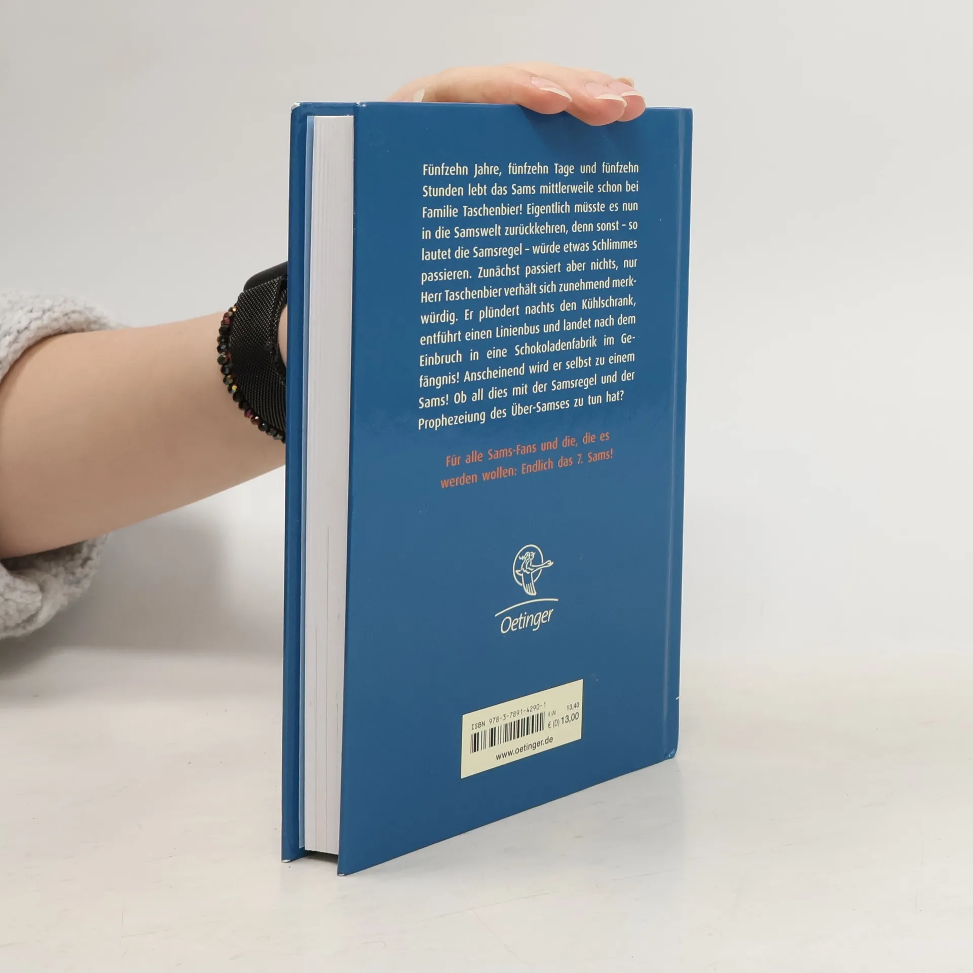 Wunschpunktwunderbar: das knuffigste Sams aller Zeiten! Was wäre Familie Taschenbier ohne das Sams? Das rüsselnasige Wesen ist Herrn Taschenbier wie ein eigenes Kind ans Herz gewachsen. Doch eines Tages ist das Sams weg. Zu seinem eigenen Entsetzen muss es nach 15 Jahren, 15 Tagen und 5 Minuten wieder in die Samswelt zurück – denn sonst würde der Mensch, bei dem es lebt, selbst ein Sams werden. Die ersten Anzeichen gibt es bei Herrn Taschenbier bereits … Wird er wirklich zum Sams? Und muss das echte Sams seinen Papa verlassen? Eine wundersame Träne führt zu einer überraschenden Lösung... Rasant, turbulent und voller Einfälle - eine der stärksten Sams-Geschichten! Erstmals mit farbigen Innen-Illustrationen. Die Bände der Sams-Reihe sind sowohl mit den Original-Illustrationen von Paul Maar erhältlich als auch modern interpretiert von Star-Illustration Nina Dulleck: Band 1: Eine Woche voller Samstage Band 2: Am Samstag kam das Sams zurück Band 3: Neue Punkte für das Sams Band 4: Ein Sams für Martin Taschenbier Band 5: Sams in Gefahr Band 6: Onkel Alwin und das Sams Band 7: Sams im Glück Band 8: Ein Sams zu viel Band 9: Das Sams feiert Weihnachten Band 10: Das Sams und der blaue Drache Band 11: Das Sams und die große Weihnachtssuche